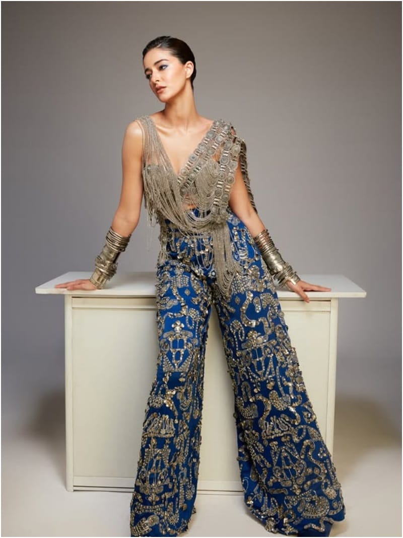 अभिनेत्री सिल्वर और ब्लू बोल्ड आउटफिट में शानदार लग रही थीं। डार्क ब्लू हाई-वेस्ट प्लाजो पैंट और स्टेटमेंट ब्लाउज में सिल्वर चेन की स्टाइलिंग ने अभिनेत्री के लुक को बोल्डनेस दी, जिस पर सभी की निगाहें टिकी रह गईं। ढेर सारी सिल्वर बैंगल ने उनके लुक को और भी इंटेंस बना दिया।