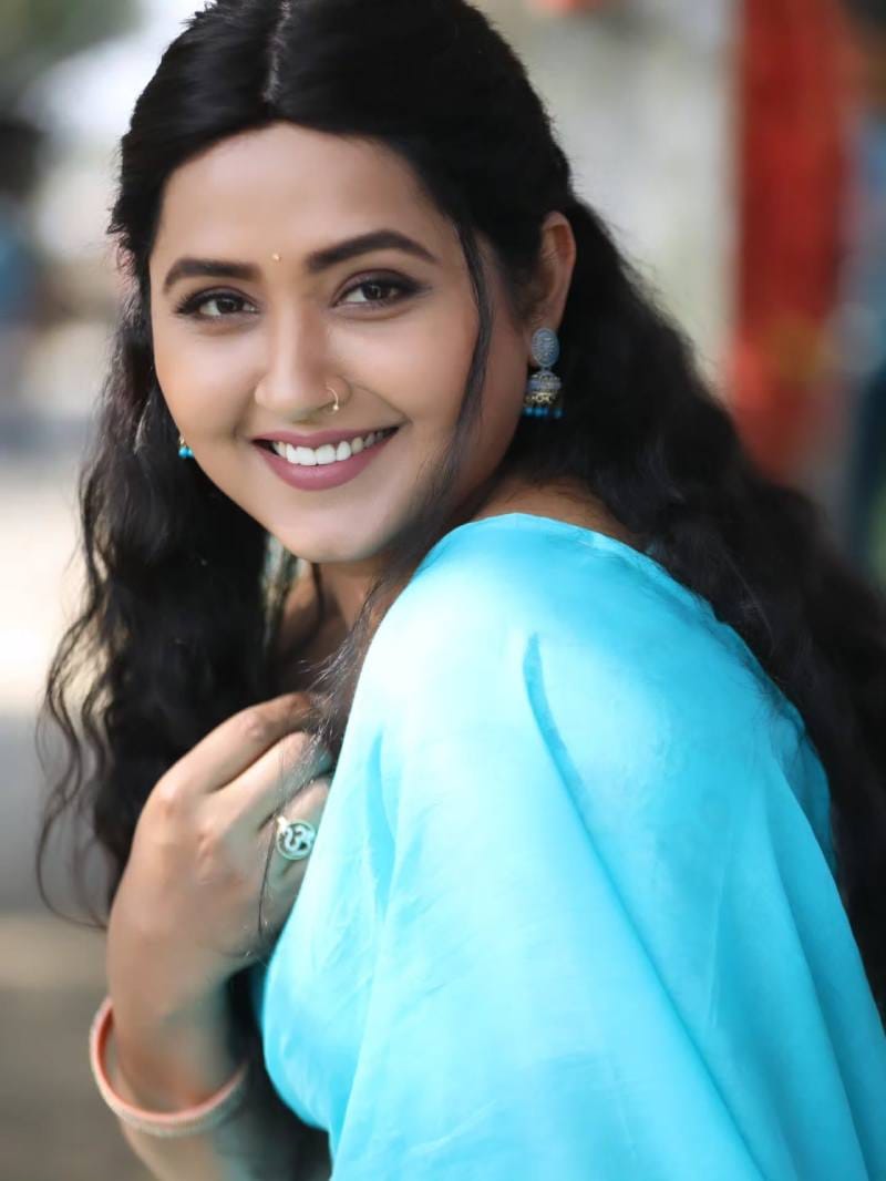 भोजपुरी एक्ट्रेस आसमानी रंग की साड़ी में नजर आ रही हैं