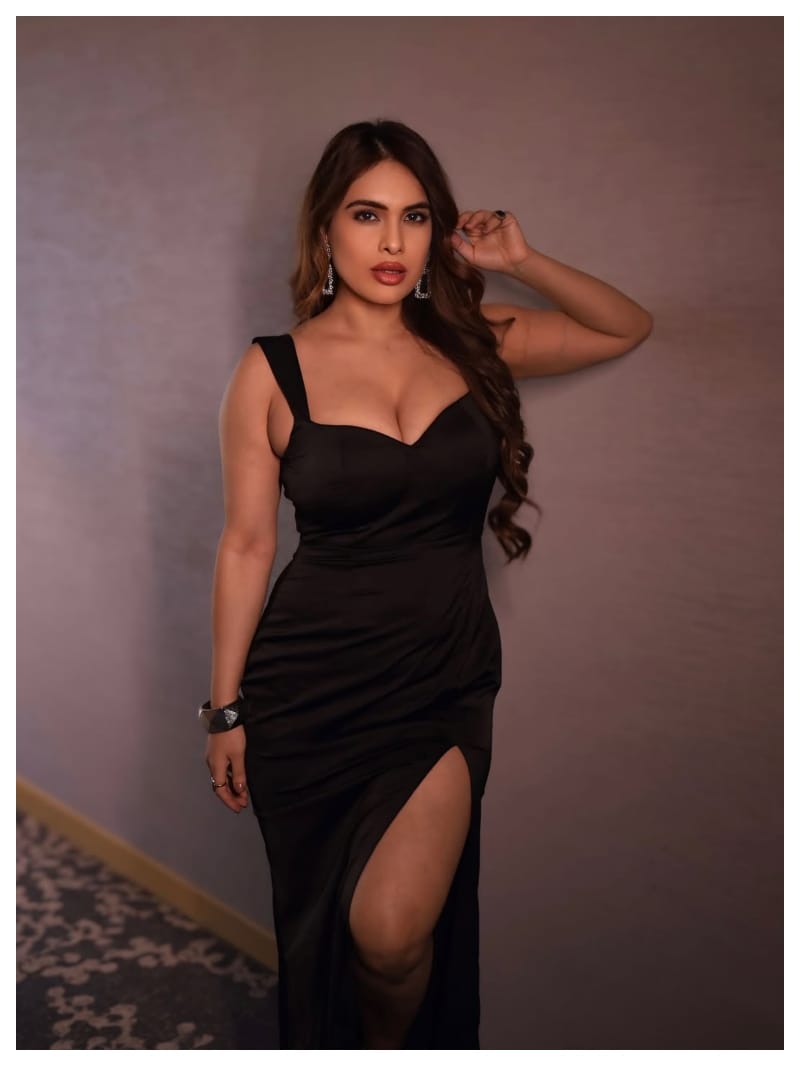 इस नए लुक में नेहा ब्लैक थाई स्लिट गाउन में सिजलिंग पोज देती नजर आ रही हैं