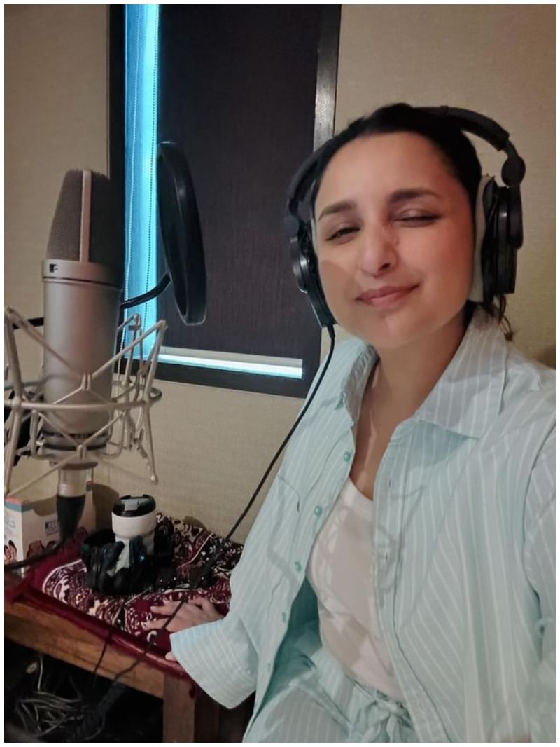इस तस्वीर में वह स्टूडियो में माइक पर डबिंग करती नजर आ रही है