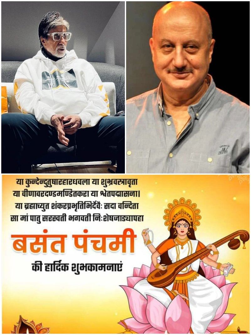 वसंत पंचमी पर इन सितारों ने किया मां सरस्वती का नमन आज वसंत पंचमी का त्यौहार मनाया जा रहा है, इस दिन मां सरस्वती की पूजा अर्चना की जाती है सेलेब्स भी इस दिन की शुभकामनाएं दे रहे हैं अमिताभ बच्चन ने वसंत पंचमी पर पोस्ट साझा कर इस दिन की शुभकामनाएं दी हैं बिग बी ने लिखा, 'आप तथा आपके परिवार को बसंत पंचमी की ढेर सारी हार्दिक शुभकामनाएं' अनुपम खेर ने भी फैंस को वसंत पंचमी की शुभकामनाएं दी हैं उन्होंने लिखा, 'आप सभी को सरस्वती पूजा एवं वसंत पंचमी की बहुत बहुत बधाई और शुभकामनाएं! मां सरस्वती का आशीर्वाद आप पर हमेशा बरसता रहे! जय माता की!' ....