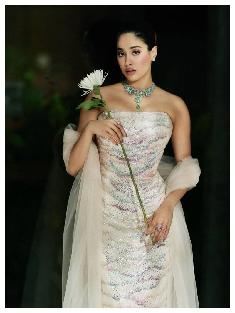 इन तस्वीरों में बॉलीवुड अभिनेत्री जाह्नवी कपूर ने राहुल मिश्रा कॉउचर का गाउन पहना है