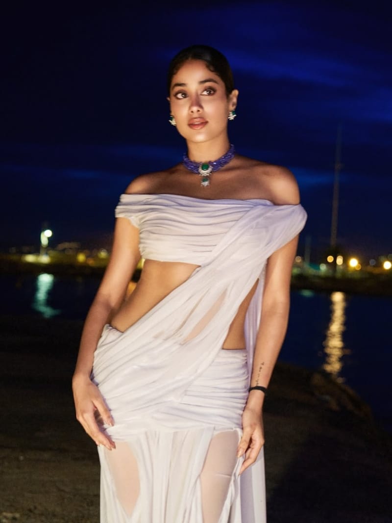 इस नए लुक में जान्हवी व्हाइट ड्रिपिंग साड़ी में नजर आ रही हैं