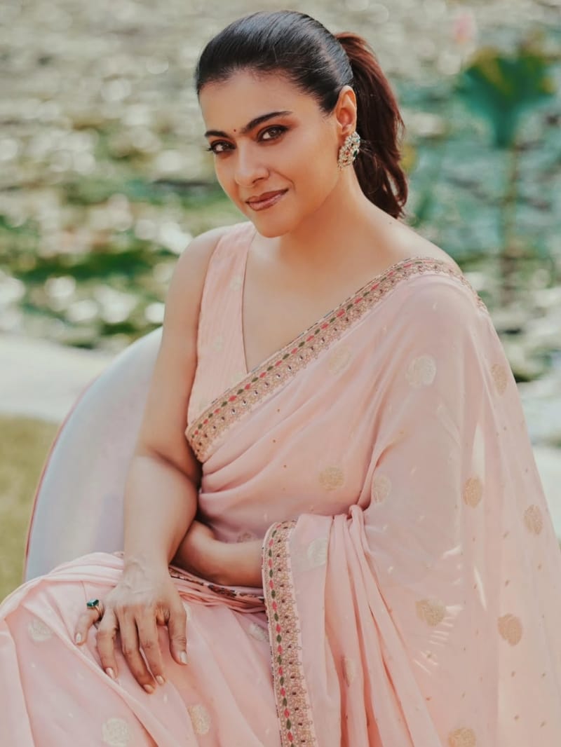 पीच रंग की साड़ी में काजोल का लुक सिंपल और सोवर दिखा