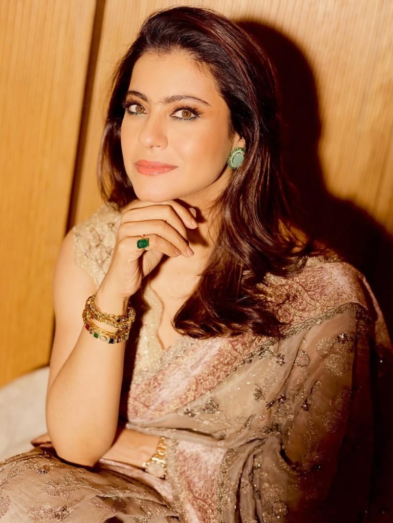इन तस्वीरों में काजोल गोल्डन रंग की कढ़ाईदार साड़ी में पोज देती नजर आ रही हैं
