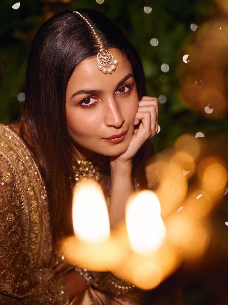 दिवाली लुक में आलिया ने गोल्डन रंग की स्टाइलिश ट्रेडिशनल ड्रेस पहनी है