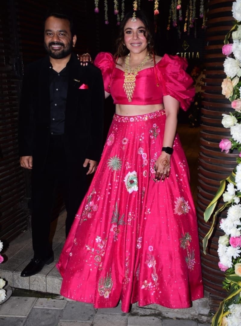 रिसेप्शन पार्टी में अप्सरा लगीं मानवी गगरू मानवी गगरू और वरुण कुमार 23 फरवरी को शादी के बंधन में बंधे थे, जिसके बाद कपल ने मुंबई में रिसेप्शन पार्टी का आयोजन किया है मानवी और वरुण की रिसेप्शन पार्टी की फोटोज सोशल मीडिया पर वायरल हो रही हैं इन तस्वीरों में मानवी और वरुण बहुत अच्छे लग रहे हैं मानवी ने अपनी रिसेप्शन पार्टी के लिए पिंक कलर का लहंगा और मैचिंग ब्लाउज पहना हुआ है इसके साथ ही मानवी ने गले में गोल्डन नेकलेस पहना हुआ है और साथ में उन्होंने मांग टीका भी पहना है मानवी के पति वरुण ने ब्लैक पैंट सूट पहना है, जिसमें वह भी बेहद शानदार नजर आ रहे हैं कपल की इस रिसेप्शन पार्टी में दोनों के माता पिता भी शामिल हुए हैं, जो कि तस्वीरों में साथ नजर आ रहे हैं आपको बता दें कि मानवी और वरुण की सगाई 2023 की जनवरी में हुई थी Maanvi Gagroo