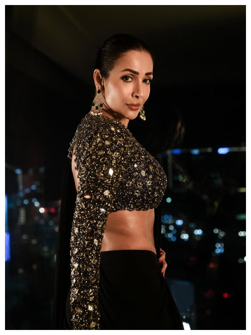 इन तस्वीरों में मलाइका ने ब्लैक चमचमाती साड़ी पहनी है
