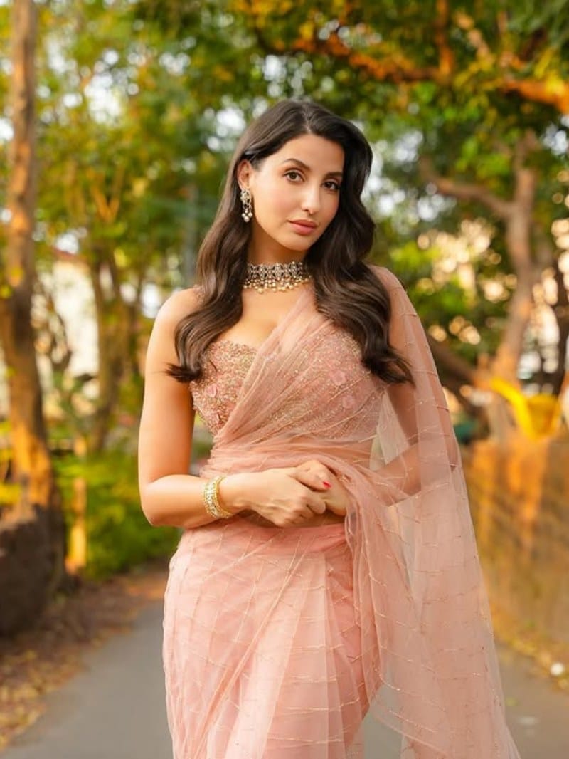 इन तस्वीरों में नोरा फतेही का देसी लुक देखने को मिल रहा है। उन्होंने पीच कलर की खूबसूरत साड़ी पहनी है। यह साड़ी उन्हें बेहद स्टाइलिश और आकर्षक बना रही है।