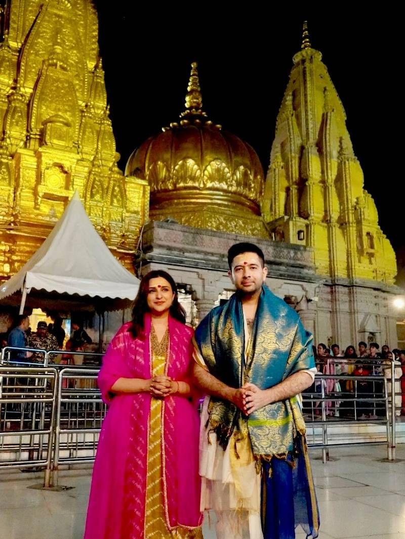 एक तस्वीर में परिणीति और राघव मंदिर के सामने खड़े नजर आ रहे हैं।