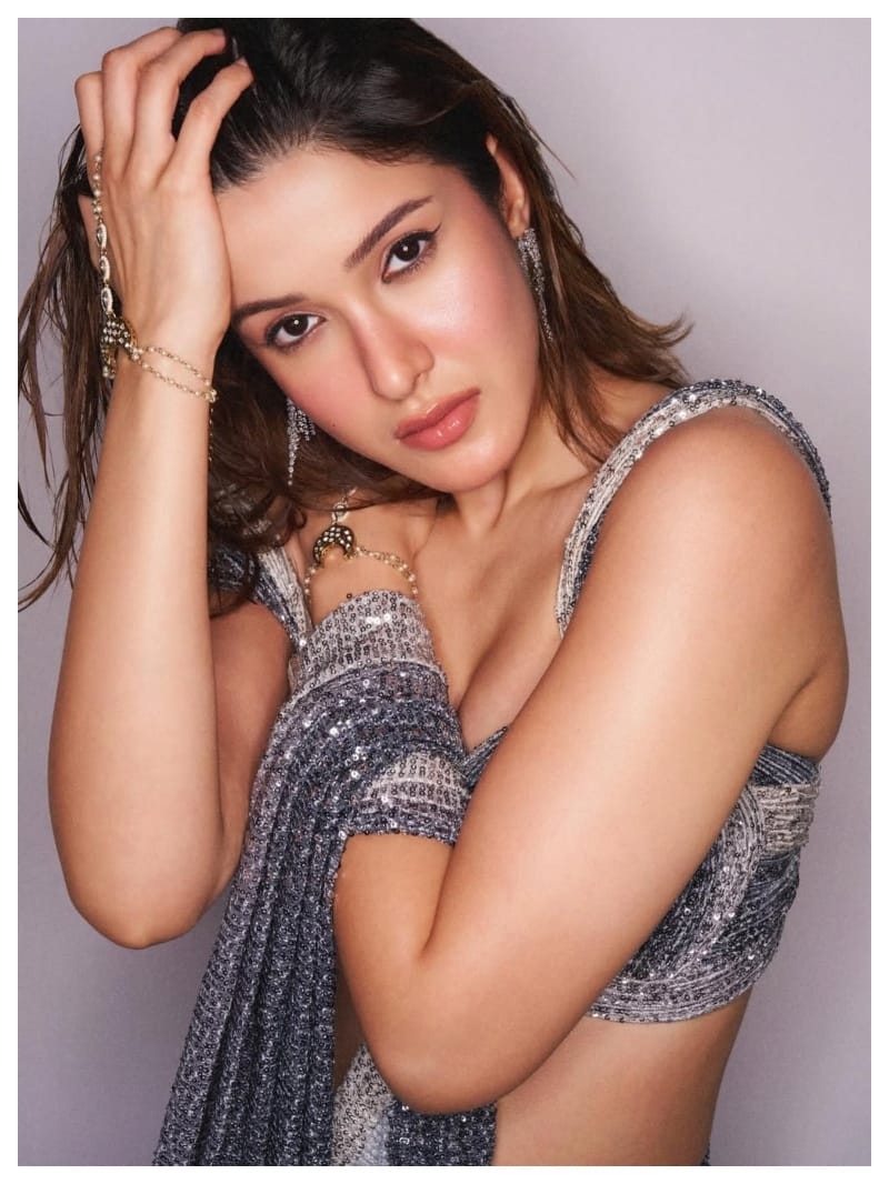 इन तस्वीरों में शनाया ने सिल्वर और ग्रे रंग शाइनिंग साड़ी पहनी हुई है