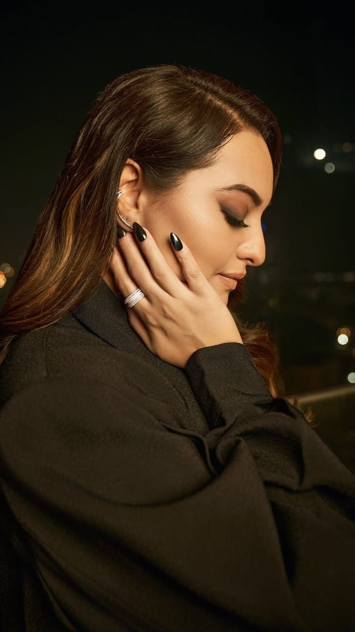 सोनाक्षी ने ब्लैक नेल पेंट लगाई है और हाथों में रिंग्स भी पहनी है