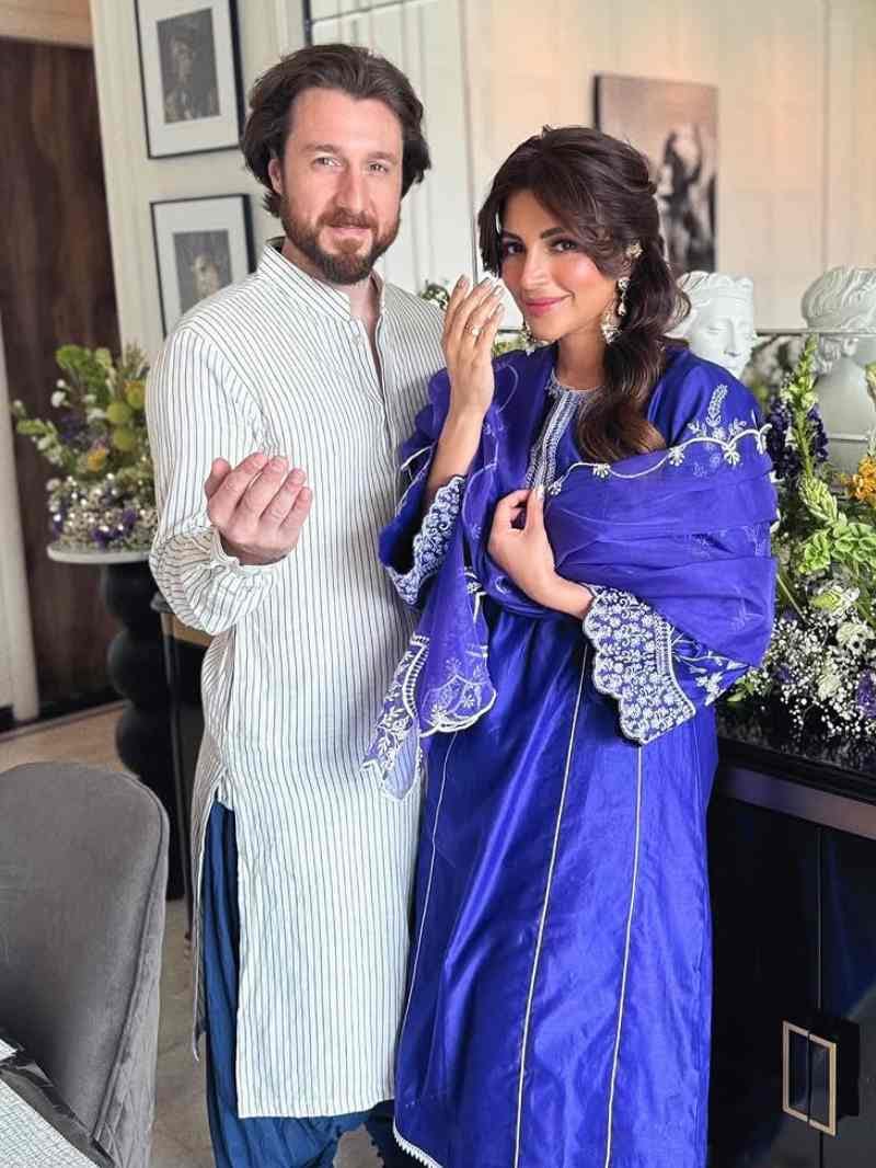 शमा सिकंदर ब्लू कलर के सूट में बेहद खूबसूरत लग रही हैं, वे अपने पति जेम्स मिलिरोन के साथ पोज देती नजर आ रही हैं