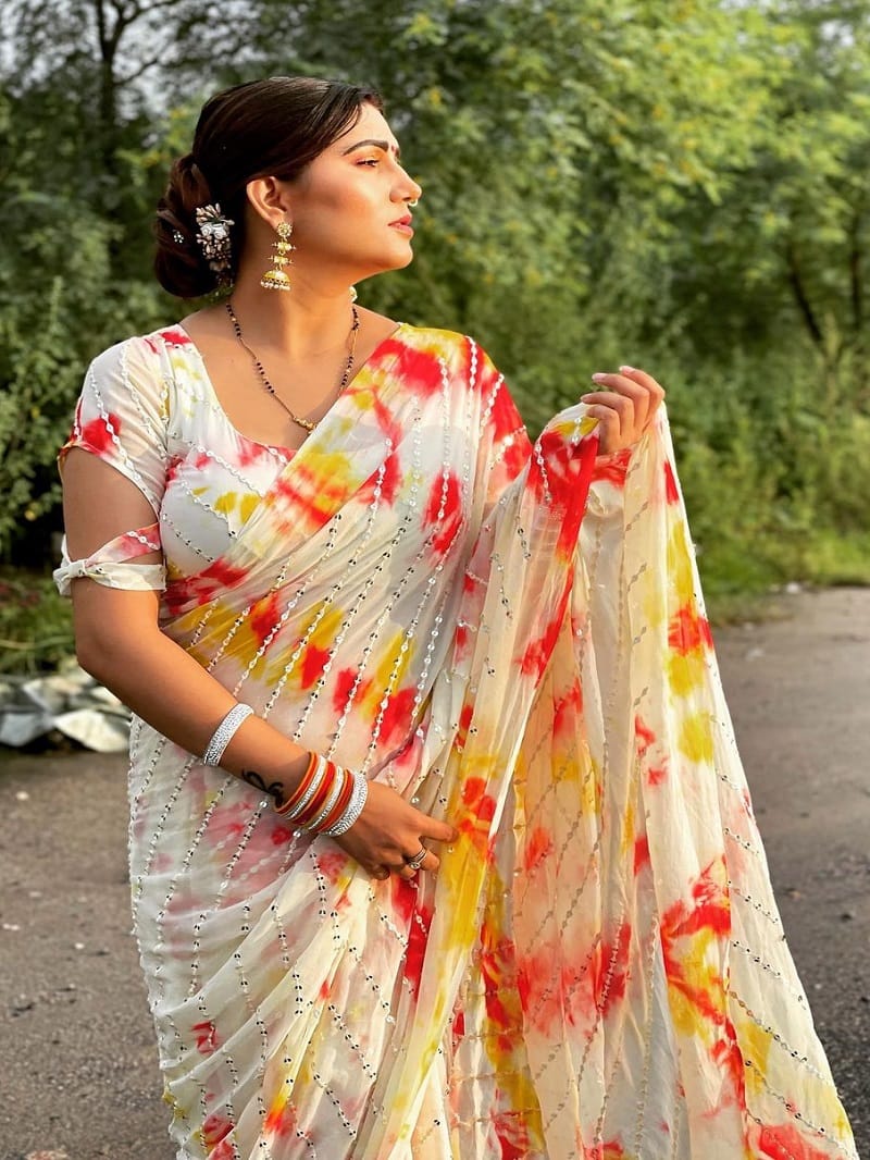 मांग में सिंदूर और व्हाइट कलर की फ्रिल्ड साड़ी को कैरी किए सपना डांस करती बेहद खूबसूरत लग रही हैं