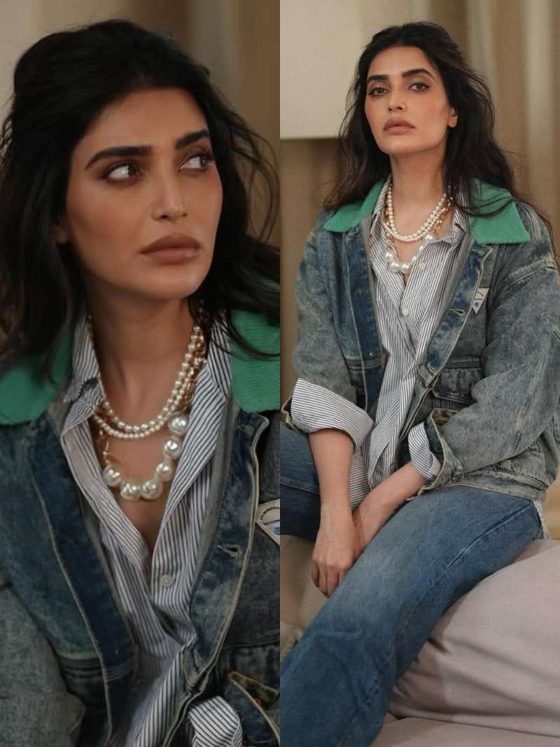 करिश्मा तन्ना ने जींस और डेनिम जैकेट पहनी है। गले में बड़ी सी माला डाली है।
