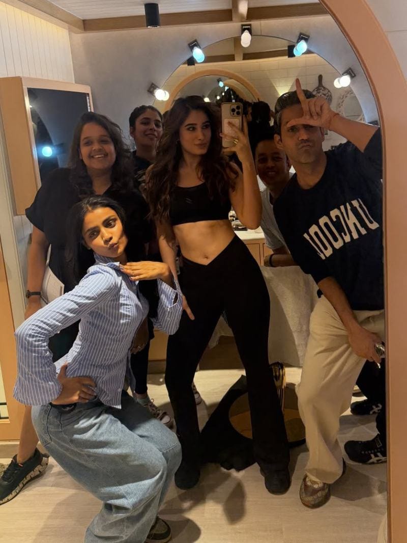 तस्वीरों में देखा जा सकता है कि वह मेकअप करा रही हैं और टीम के साथ पोज दे रही हैं।