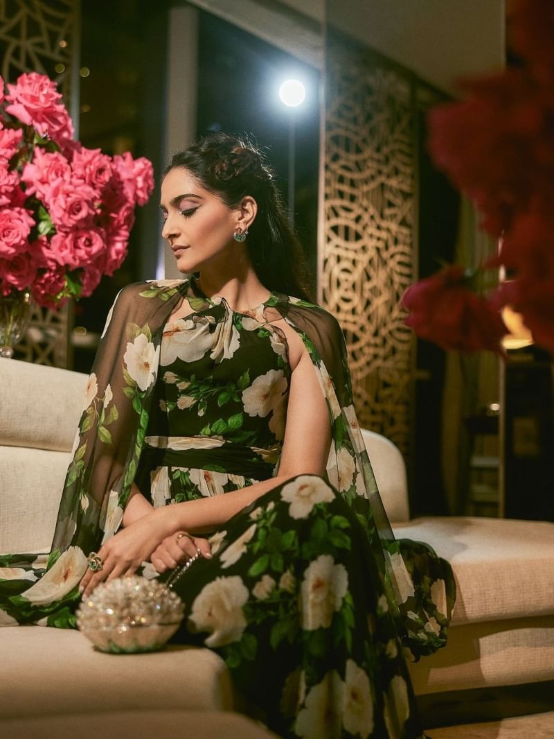सोनम ने ग्रीन रंग की फ्लोरल ड्रेस के साथ सुंदर हेयर स्टाइल की हुई है