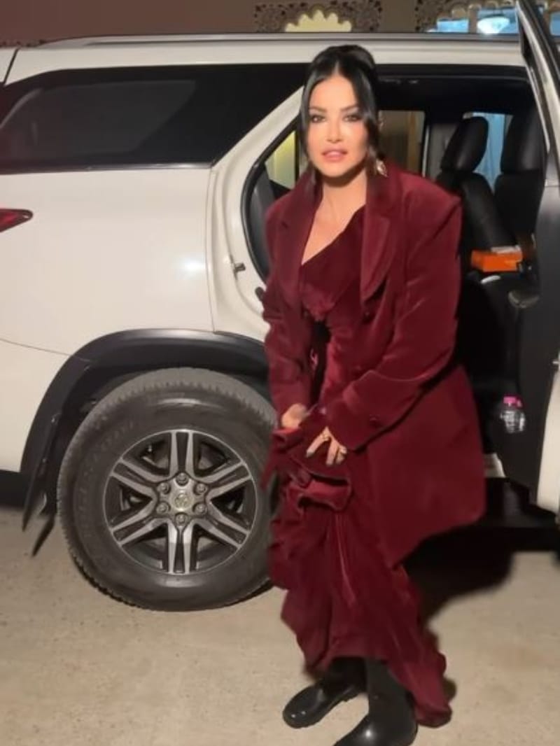 महरुन रंग की वेलवेट ड्रेस में सनी खूबसूरत दिखीं