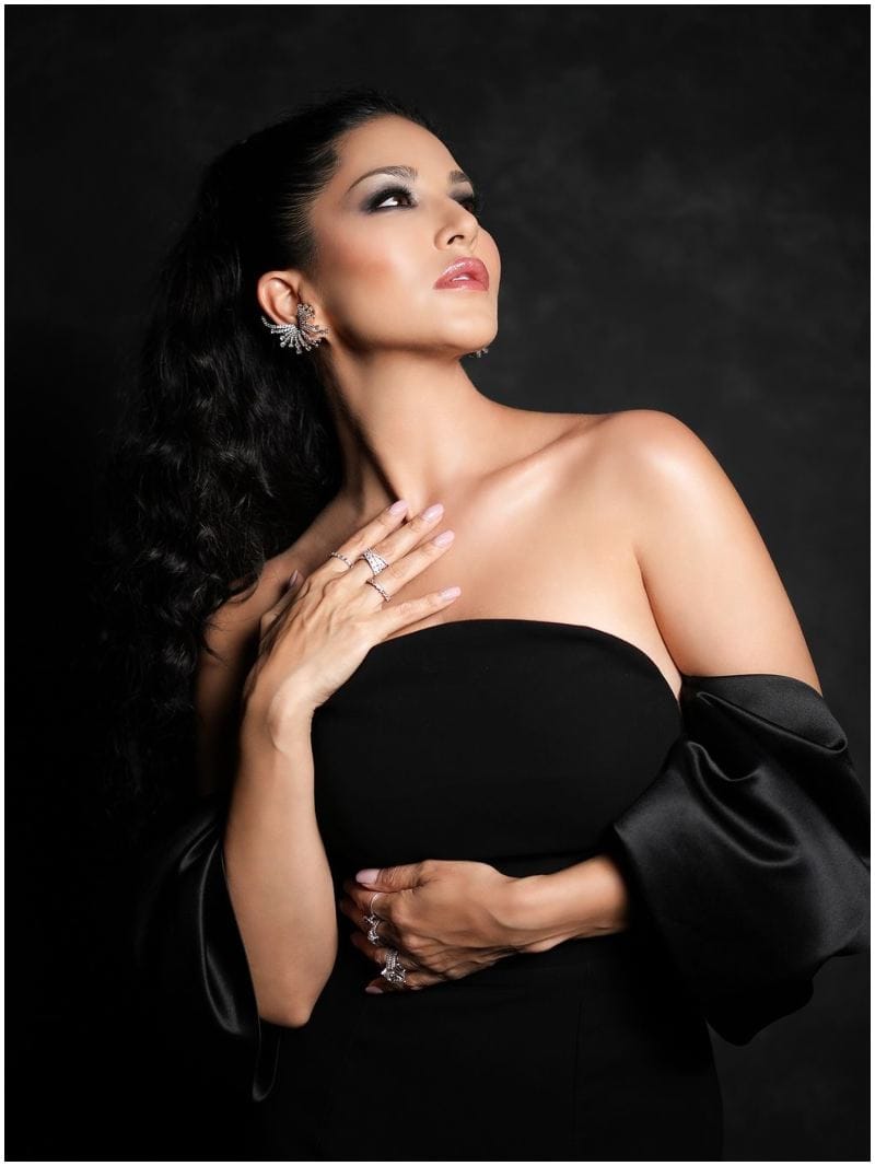 ब्लैक ड्रेस के साथ सनी ने चोटी बनाकर बालों को स्टाइल किया है