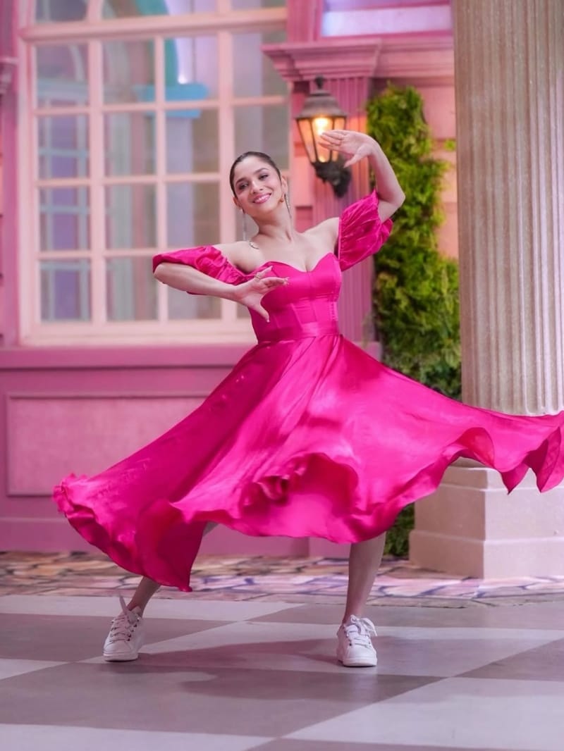 अंकिता लोखंडे इस नए लुक में पिंक फ्रील ड्रेस में नजर आ रही हैं