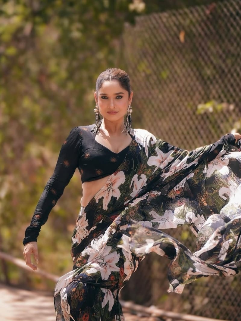 अंकिता ब्लैक साड़ी में नजर आ रही हैं, जिसपर व्हाइट प्रिंटेड फ्लॉवर बने हुए हैं