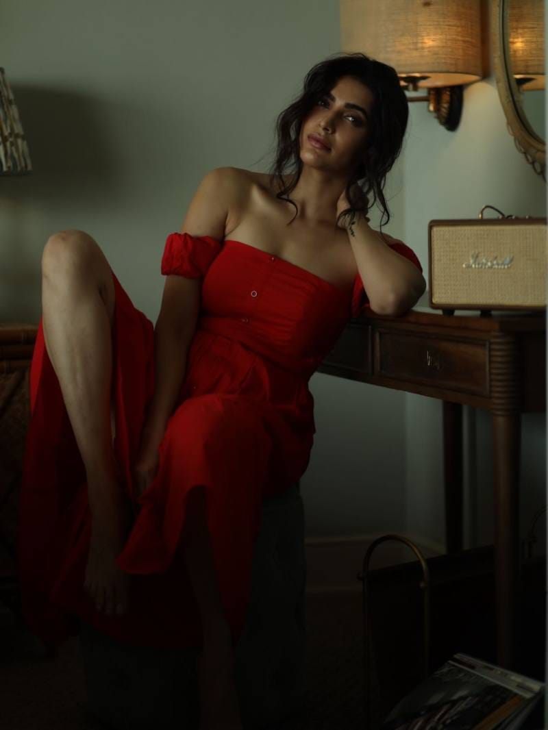 करिश्मा ने ऑफ शोल्डर रेड ड्रेस में दिलकश पोज दिए हैं
