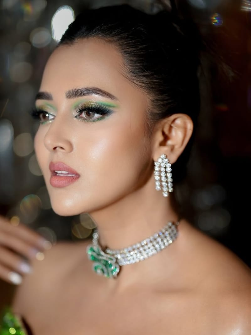 तेजस्वी ने ग्राीन रंग की ऑफ शोल्डर गाउन के साथ मैचिंग मेकअप और ज्वेलरी कैरी की है