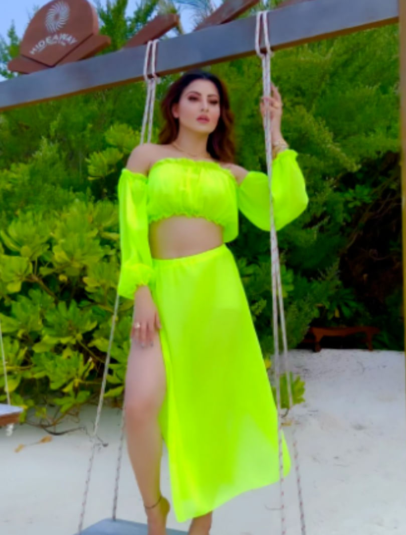 लेटेस्ट वीडियो में उर्वशी ग्रीन कलर की ऑफ शोल्डर थाई-हाई स्लिट ड्रेस पहने सिजलिंग लुक में झूला झूलती नजर आ रही हैं