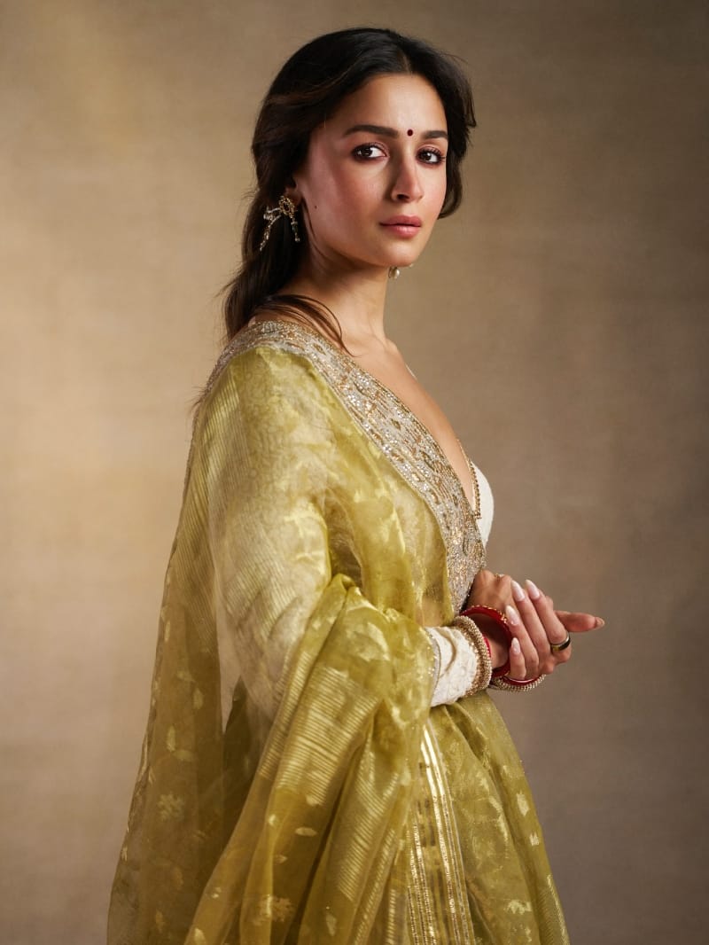 पिस्ता ग्रीन साड़ी और सफेद रंग के ब्लाउज में आलिया बेहद खूबसूरत लग रहीं थीं