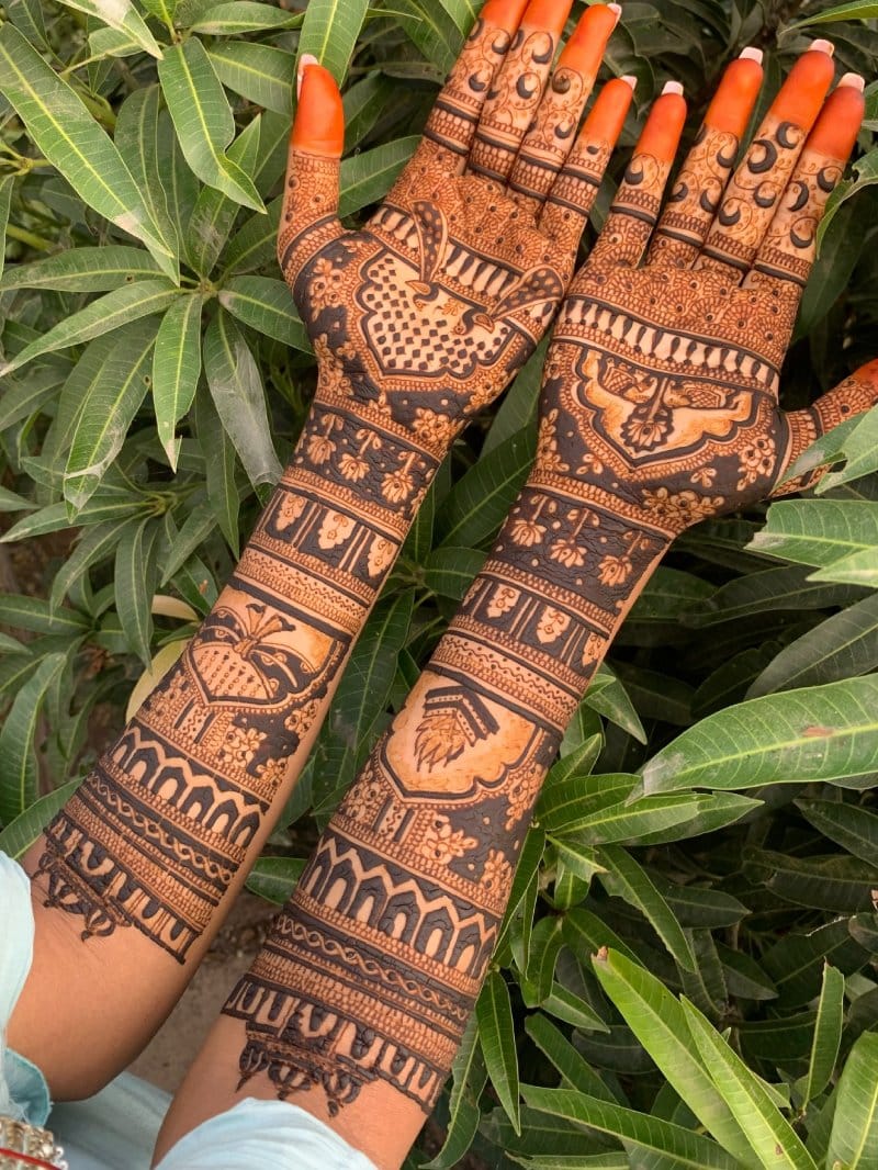ब्राइडल मेहंदी के सबसे खूबसूरत डिजाइन मेहंदी न सिर्फ दुल्हन की खूबसूरती को निखारती है, बल्कि ये भारतीय शादियों की सबसे अहम रस्मों में से एक मानी जाती है। इसी के चलते बदलते वक्त के साथ ब्राइडल मेहंदी के डिजाइन भी काफी ट्रेंडी और यूनिक हो गए हैं। आजकल दुल्हनें पारंपरिक के साथ-साथ मॉडर्न डिजाइन को भी खूब पसंद कर रही हैं। सही मेहंदी डिजाइन न सिर्फ आपकी ब्राइडल आउटफिट को और निखारती है, बल्कि आपकी पर्सनैलिटी को भी दर्शाती है इस तरह का डिजाइन पूरे हाथ को कवर करता है और इसमें फूल, पत्तियां और बारीक पैटर्न शामिल होते हैं। इस डिजाइन में मोर मोरनी की आकृति बनाई गई है, जो मेहंदी को खास टच देती है। इस तरह का डिजाइन बनवाकर आप अपने लुक को कमाल बना सकती हैं तो बस इन्हीं डिजाइनों में से अपने लिए खास डिजाइन का चयन करें bridal mehndi