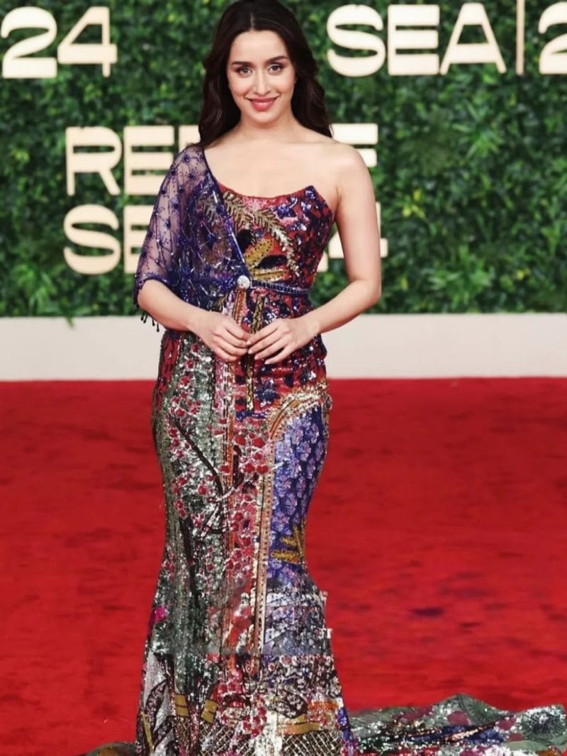इस भव्य आयोजन में श्रद्धा कपूर मल्टी कलर शिमरी वन ऑफ शोल्डर बॉडीकॉन गाउन में नजर आईं