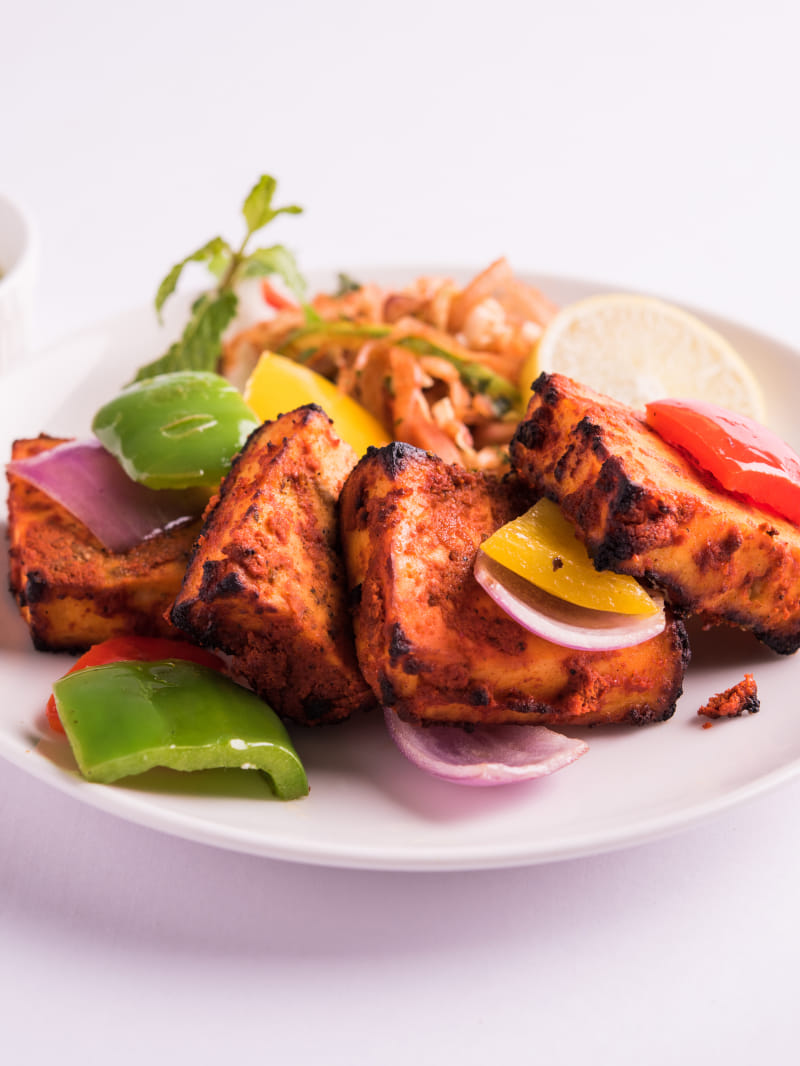 अब आपका पनीर टिक्का तैयार है, इसपर चाट मसाला और नींबू का रस डालकर सर्व करें