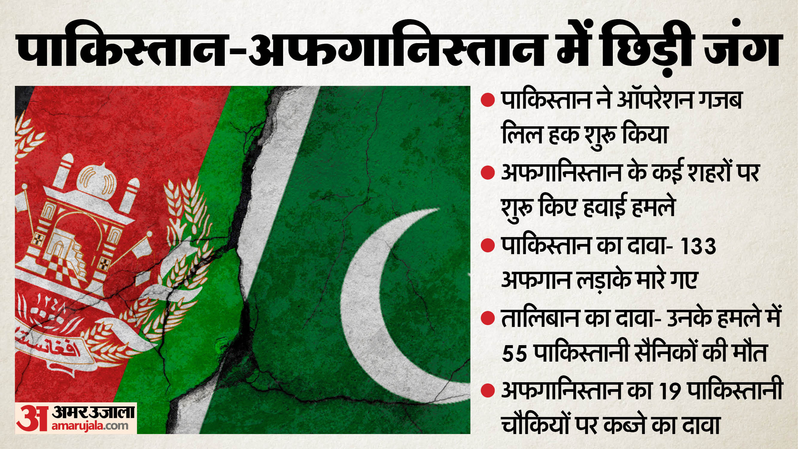 वहीं अब पाकिस्तान पर तालिबान के हमले के बाद खुली जंग का एलान हो चुका है। पाकिस्तान की तरफ से काबुल और कंधार पर बमबारी की गई। पाकिस्तान ने ऑपरेशन 'गजब-लिल-हक' में 133 की मौत का दावा किया है। वहीं अफगानिस्तान ने भी जवाबी कार्रवाई शुरू कर दी है। अफगान सैनिकों ने सीमा पर हमले तेज कर दिए हैं।