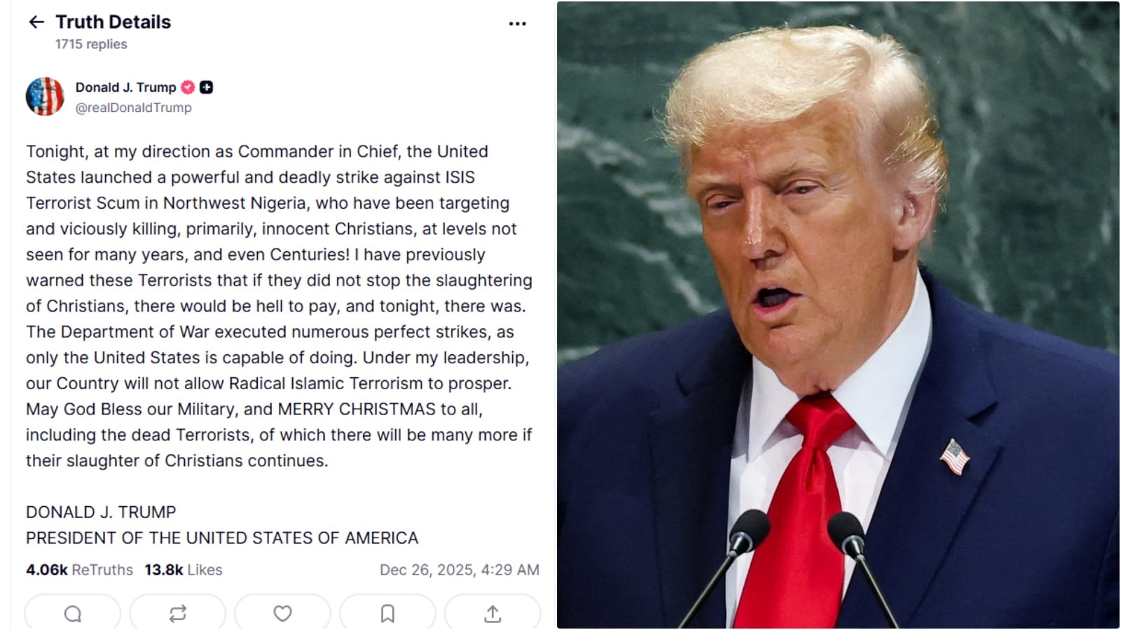 राष्ट्रपति डोनाल्ड ट्रंप ने कहा कि अमेरिका ने गुरुवार (स्थानीय समय) को उत्तर-पश्चिम नाइजीरिया में आतंकी संगठन इस्लामिक स्टेट के खिलाफ एक "घातक" हमला किया है। ट्रंप ने कहा, "आज रात, कमांडर इन चीफ के तौर पर मेरे निर्देश पर, अमेरिका ने उत्तर-पश्चिम नाइजीरिया में ISIS के आतंकवादी बदमाशों के खिलाफ एक शक्तिशाली और घातक हमला किया, जो मुख्य रूप से निर्दोष ईसाइयों को निशाना बना रहे थे और बेरहमी से मार रहे थे, ऐसा कई वर्षों और सदियों में नहीं देखा गया था! मैंने पहले ही इन आतंकवादियों को चेतावनी दी थी कि अगर उन्होंने ईसाइयों का कत्लेआम बंद नहीं किया, तो उन्हें इसका अंजाम भुगतना पड़ेगा, और आज रात ऐसा ही हुआ।"