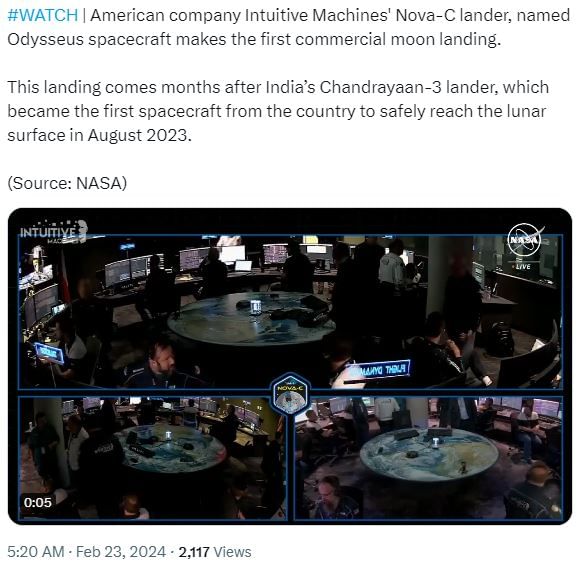 #WATCH | American company Intuitive Machines' Nova-C lander, named Odysseus spacecraft makes the first commercial moon landing.