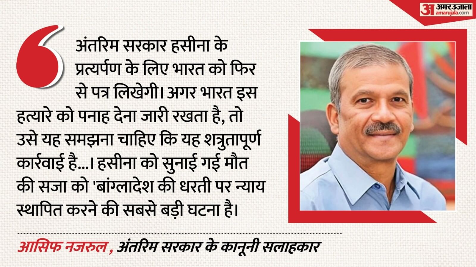 प्रत्यर्पण संधि के अनुसार, शेख हसीना को भारत से वापस भेजे जाने की अपील को लेकर अंतरिम सरकार के कानूनी सलाहकार आसिफ नजरुल ने कहा, अंतरिम सरकार हसीना के प्रत्यर्पण के लिए भारत को फिर से पत्र लिखेगी। बांग्ला भाषा के अखबार प्रथम अलो (Prothom Alo) ने नजरुल के हवाले से कहा, 'अगर भारत इस हत्यारे (mass murderer) को पनाह देना जारी रखता है, तो उसे यह समझना चाहिए कि यह शत्रुतापूर्ण कार्रवाई है...।' उन्होंने हसीना को सुनाई गई मौत की सजा को 'बांग्लादेश की धरती पर न्याय स्थापित करने की सबसे बड़ी घटना' बताया। उन्होंने कहा, 'मुझे इस फैसले पर कोई आश्चर्य नहीं है। हसीना और उनके सहयोगियों ने मानवता के विरुद्ध अपराध किए हैं। अकाट्य और पुख्ता सबूतों को देखते हुए दुनिया की किसी भी अदालत में मुकदमा चलाए जाने पर उन्हें कड़ी से कड़ी सजा मिलनी ही चाहिए थी।