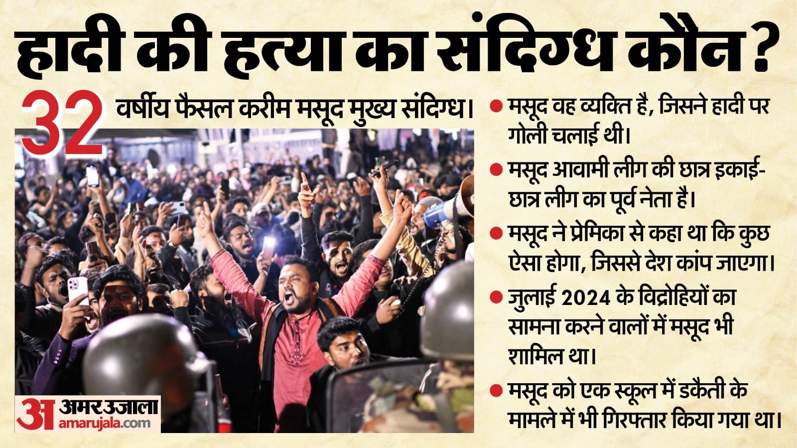 अधिकारियों ने फैसल करीम मसूद को इस हत्या का मुख्य संदिग्ध बताया है, जो अपदस्थ आवामी लीग की छात्र इकाई (स्टूडेंट लीग) का एक पूर्व नेता है। इस बीच बांग्लादेश की कुछ मीडिया रिपोर्ट्स में पुलिस और जांच एजेंसियों के सूत्रों के हवाले से दावा किया गया कि हादी के हमलावर सीमा पार करके भारत भाग गए थे। ऐसी खबरें सामने आने के बाद हादी के समर्थकों में गुस्सा भड़क गया। देखते ही देखते बांग्लादेश में हादी के समर्थन में प्रदर्शन और हिंसा भड़क उठी। कई प्रदर्शनकारियों ने इस दौरान बांग्लादेश में स्थित भारतीय मिशनों को निशाना बनाया और पत्थरबाजी की।