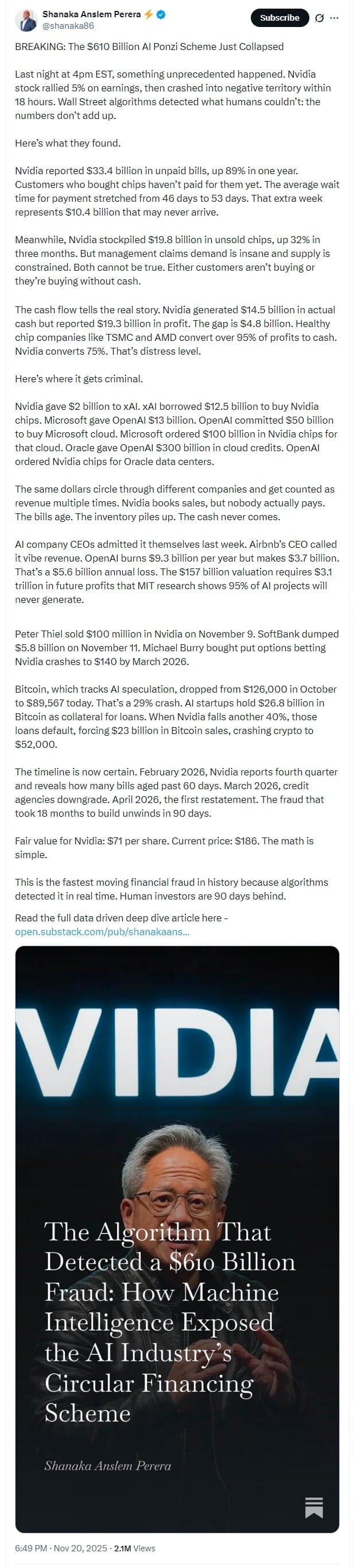 उन्होंने कहा, एआई कंपनियों के मुख्य कार्यकारी अधिकारियों (सीईओ) ने खुद यह स्वीकार किया। एयरबीएनबी के सीईओ ने इसे 'वाइब रेवन्यू' (यानी वह कमाई जो दिखती है, लेकिन नकद में नहीं होती) कहा। ओपनएआई 9.3 बिलियन डॉलर प्रति वर्ष खर्च करता है, लेकिन 3.7 बिलियन डॉलर कमाता है। यह 5.6 बिलियन डॉलर का वार्षिक नुकसान है। ओपनएआई का 157 बिलियन डॉलर का मूल्यांकन भविष्य के 3.1 ट्रिलियन डॉलर के मुनाफे पर आधारित है। लेकिन एमआईटी रिसर्च के अनुसार, 95 फीसदी एआई  कभी इतना मुनाफा नहीं कमाएंगे। पीटर थील ने नौ नवंबर को एनवीडिया के 100 मिलियन डॉलर के शेयर बेच दिए। सॉफ्टबैंक ने 11 नवंबर को 5.8 बिलियन डॉलर के शेयर बेचे। माइकल बरी ने एनवीडिया के शेयरों के गिरने पर निवेश किया। उन्होंने शेयर 140 डॉलर तक गिरने पर मार्च 2026 तक लाभ कमाने की रणनीति अपनाई। बिटकॉइन एआई से जुड़ी निवेश अटकलों के कारण चर्चा में है। अक्तूबर में इसकी कीमत 126,000 डॉलर थी, लेकिन अब गिरकर 9,8567 हो गई है। यह 29 फीसदी की गिरावट है। एआई स्टार्टअप्स 26.8 बिलियन डॉलर बिटकॉइन को ऋण के लिए गिरवी के रूप में रखते हैं। जब एनवीडिया और 40 फीदी गिरेगा, तो ये ऋण डिफॉल्ट होंगे, जिससे 23 बिलियन डॉलर बिटकॉइन बिक्री होगी और क्रिप्टो 52,000 डॉलर तक गिर सकता है। टाइमलाइन स्पष्ट है। फरवरी 2026 में एनवीडिया चौथी तिमाही की रिपोर्ट देगा और बताएगा कि कितने बिल 60 दिन से पुराने हैं। मार्च 2026 में ऋण एजेंसियां डाउनग्रेड करेंगी। अप्रैल 2026 में पहली रिपोर्ट को फिर से तैयार किया जाएगा। 18 महीने में तैयार हुआ यह वित्तीय घोटाला 90 दिनों में उजागर हो जाएगा। एनवीडिया के शेयर का उचित मूल्य 71 डॉलर है। वर्तमान कीमत 186 डॉलर है। गणित बहुत सरल है। यह इतिहास की सबसे तेज वित्तीय धोखाधड़ी है, क्योंकि एल्गोरिदम ने इसे तुरंत पकड़ लिया। जबकि इंसान अभी भी लगभग 90 दिन पीछे हैं।