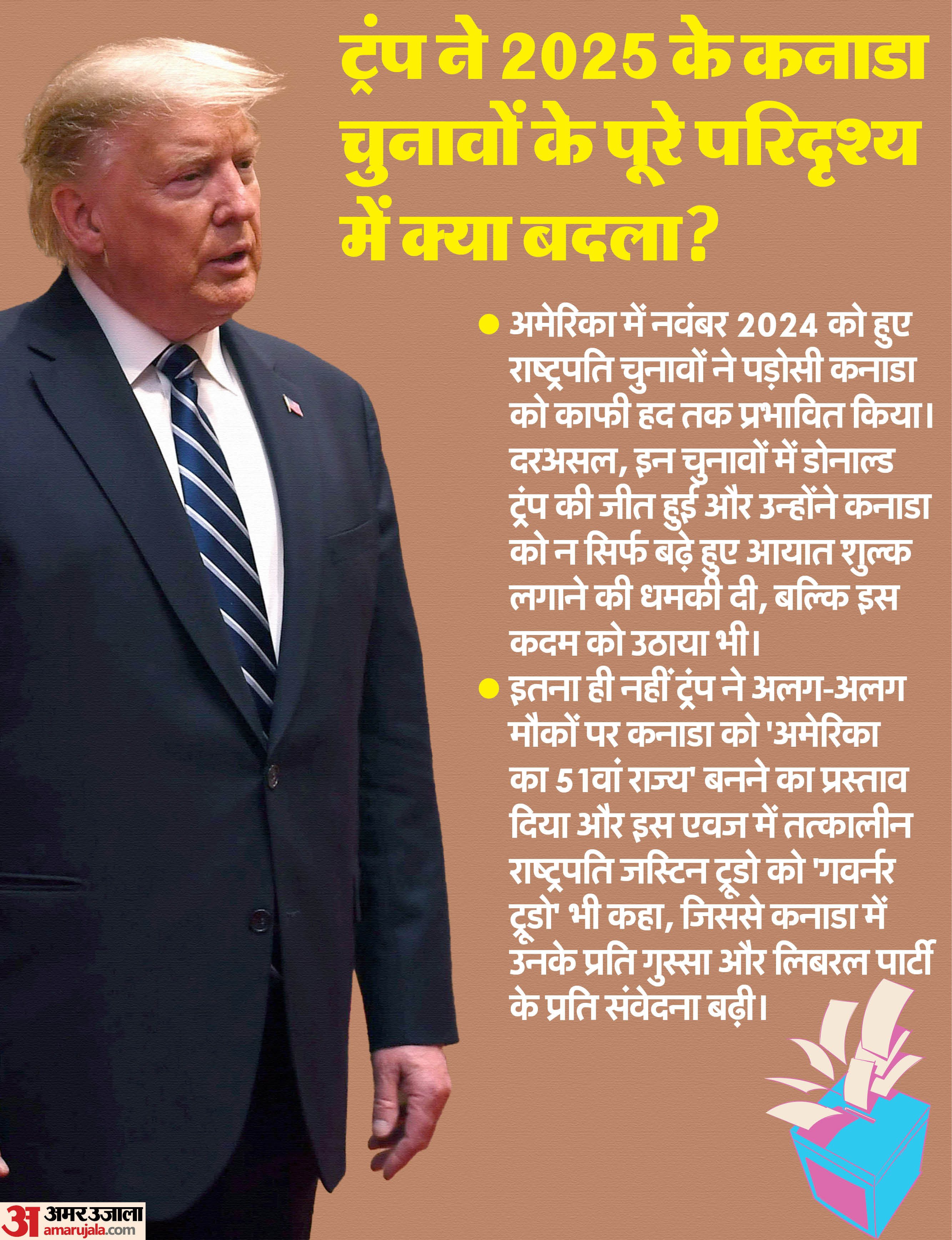 - दूसरी तरफ कनाडा में विपक्षी कंजर्वेटिव पार्टी का नेतृत्व कर रहे हैं पियरे पॉइलिवर, जिनकी गिनती दक्षिणपंथी नेताओं में होती है। ट्रूडो के शासन के दौरान पियरे की लोकप्रियता जबरदस्त तौर पर बढ़ी और उनके प्रधानमंत्री बनने की संभावना सबसे ज्यादा थी। हालांकि, इसके बाद पूरे परिदृश्य में ट्रंप की एंट्री हुई।