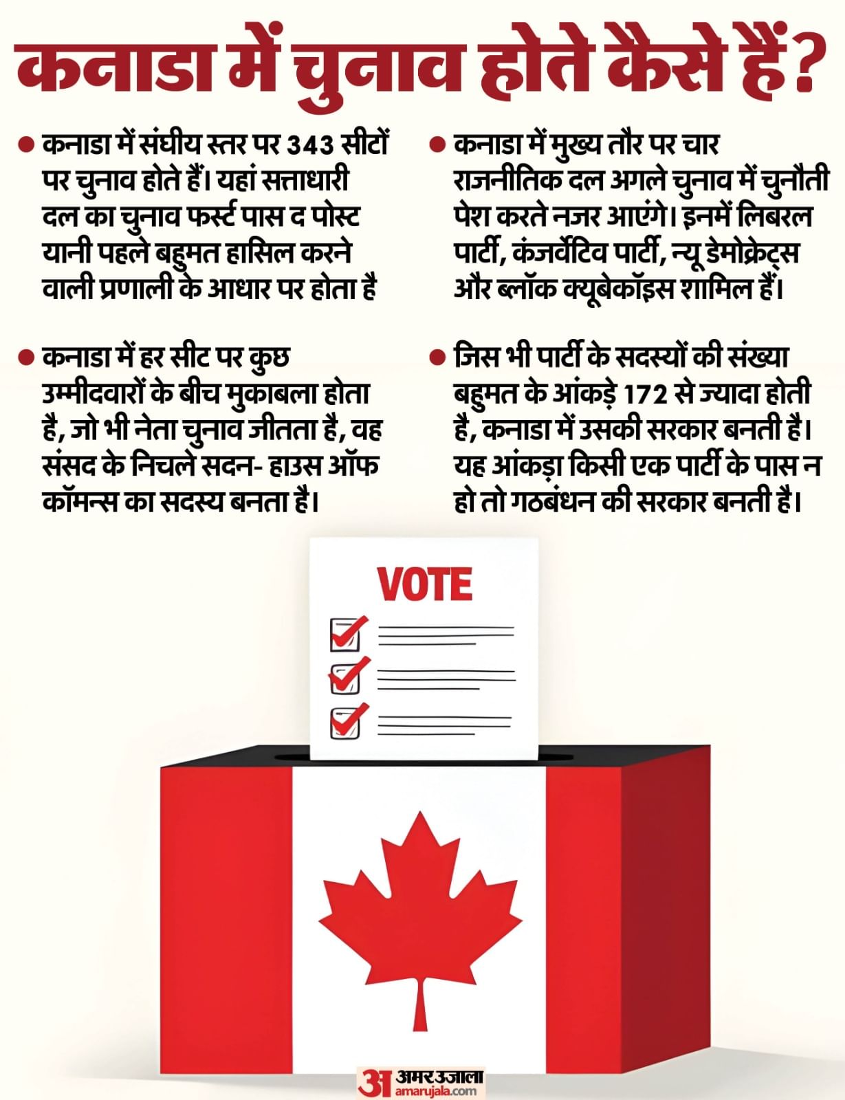 कनाडा में 28 अप्रैल यानी आज आम चुनाव के लिए मतदान का दिन है। कनाडा के समयानुसार सुबह 7 बजे से वोटिंग शुरू हो गई, जो कि शाम के 7 बजे तक जारी रहेगी। यानी भारतीय समयानुसार सोमवार शाम 4.30 बजे से मंगलवार सुबह 4.30 बजे तक वोटिंग जारी रहेगी। इसके बाद मतगणना का दौर शुरू हो जाएगा।ये तो हो गई कनाडा में नई सरकार के लिए होने वाले चुनाव के समय की बात। हालांकि, ऐसे कई और मुद्दे हैं, जिन्हें जानने के बाद ही कनाडा में इस बार होने वाले चुनावों को ठीक ढंग से समझा जा सकता है। मसलन, कनाडा के चुनाव इस बार अलग क्यों हैं? अमेरिका में डोनाल्ड ट्रंप के राष्ट्रपति बनने के बाद से कनाडा में सियासी समीकरण कैसे बदले हैं? कनाडा में चुनाव का तरीका क्या है? प्रधानमंत्री का चुनाव कैसे होगा? मुकाबला किस-किस चेहरे के बीच में है? आइये जानते हैं...