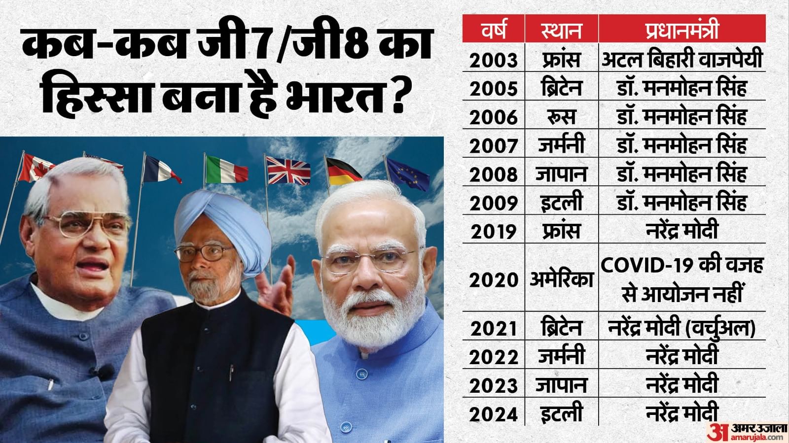 हालांकि, अगर इतिहास में थोड़ा और अंदर जाएं तो सामने आता है कि भारत सिर्फ जी7 सम्मेलन में ही नहीं, बल्कि इसके जी8 (जब रूस भी समूह का हिस्सा था) होने के समय से हिस्सा लेने के लिए आमंत्रित किया जाता रहा है। भारत को पहली बार जी8 के लिए 2003 में फ्रांस ने न्योता भेजा था। तब प्रधानमंत्री अटल बिहारी वाजपेयी ने फ्रांस के इवियन-लेस-बेंस में जी8 में हिस्सा लिया था। इसके बाद 2005 से लेकर 2009 तक प्रधानमंत्री मनमोहन सिंह और 2019 से अब तक पीएम मोदी इस सम्मेलन का हिस्सा बनते रहे हैं।