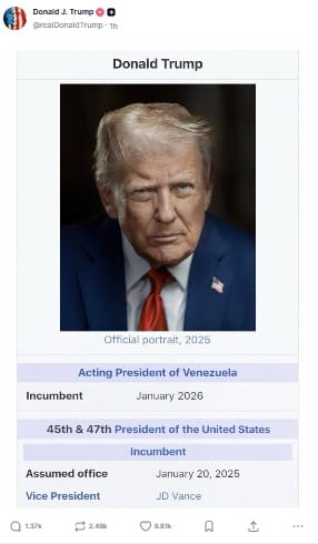 वेनेजुएला पर डोनाल्ड ट्रंप का बड़ा बयान: खुद को कार्यवाहक राष्ट्रपति घोषित किया, ट्रुथ सोशल पर साझा की तस्वीर
