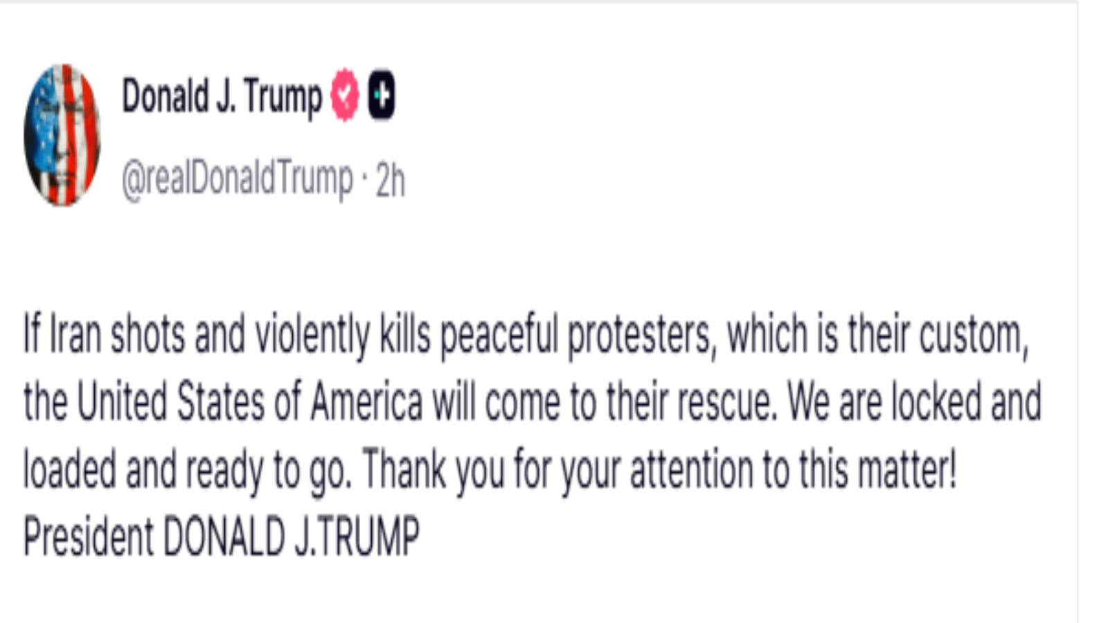 डोनाल्ड ट्रंप ने शुक्रवार (02 जनवरी) को कहा कि अगर ईरानी अधिकारी शांतिपूर्ण प्रदर्शनकारियों के खिलाफ हिंसा का इस्तेमाल करते हैं, तो संयुक्त राज्य अमेरिका जवाबी कार्रवाई के लिए पूरी तरह से तैयार है। ट्रंप ने सोशल मीडिया पर अपने एक पोस्ट में लिखा, "अगर ईरान शांतिपूर्ण प्रदर्शनकारियों पर गोलियां चलाता है और उन्हें बेरहमी से मारता है, जो कि उनकी आदत है, तो संयुक्त राज्य अमेरिका उनकी मदद के लिए आएगा। हम पूरी तरह से तैयार हैं।'