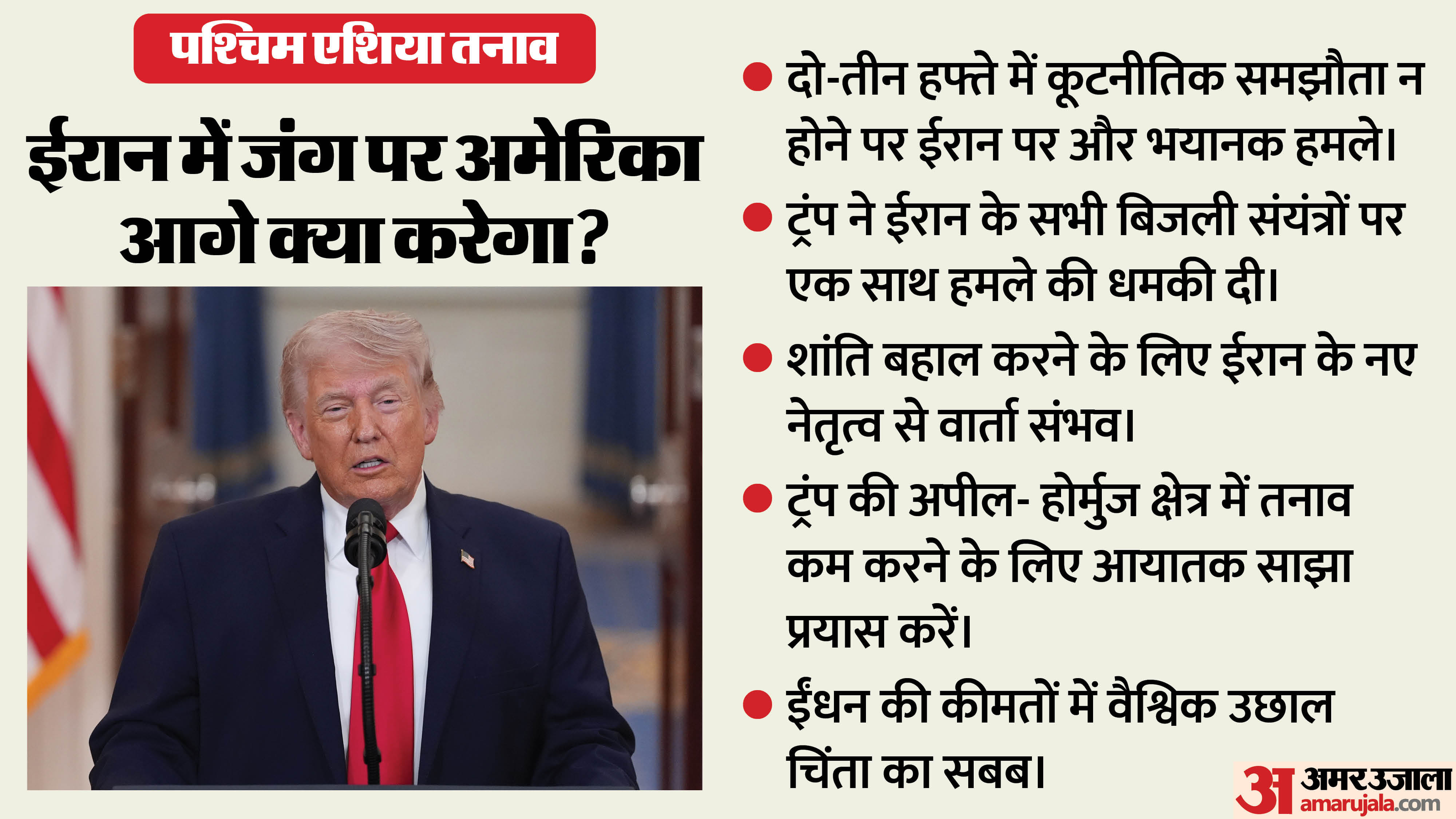 समझौता न हुआ तो भीषण हमले: उन्होंने यह भी कहा कि अगर कोई अंतिम समझौता नहीं होता है, तो अमेरिका ईरान के बिजली संयंत्रों जैसे ऊर्जा ढांचे को निशाना बनाएगा। हालांकि, अपने संबोधन में उन्होंने किसी भी चल रही बातचीत, संभावित समझौते या युद्धविराम का कोई सीधा जिक्र नहीं किया।