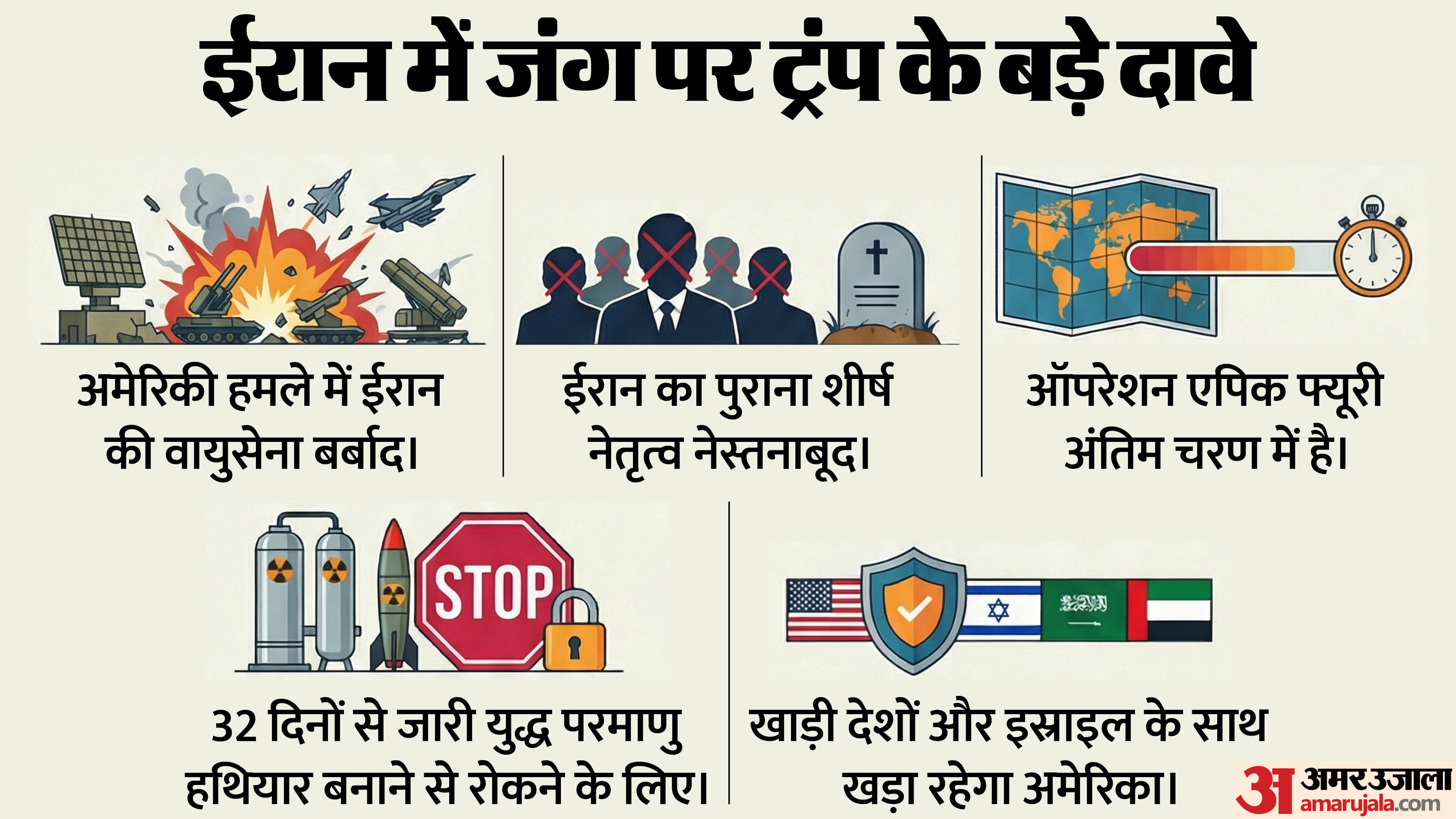 ईरान की सैन्य क्षमता नष्ट: उन्होंने दावा किया कि ईरान की सैन्य क्षमताएं लगभग खत्म कर दी गई हैं। उन्होंने कहा कि ईरानी नौसेना समाप्त हो चुकी है, वायुसेना कमजोर पड़ गई है और मिसाइल भंडार को भारी नुकसान पहुंचा है।