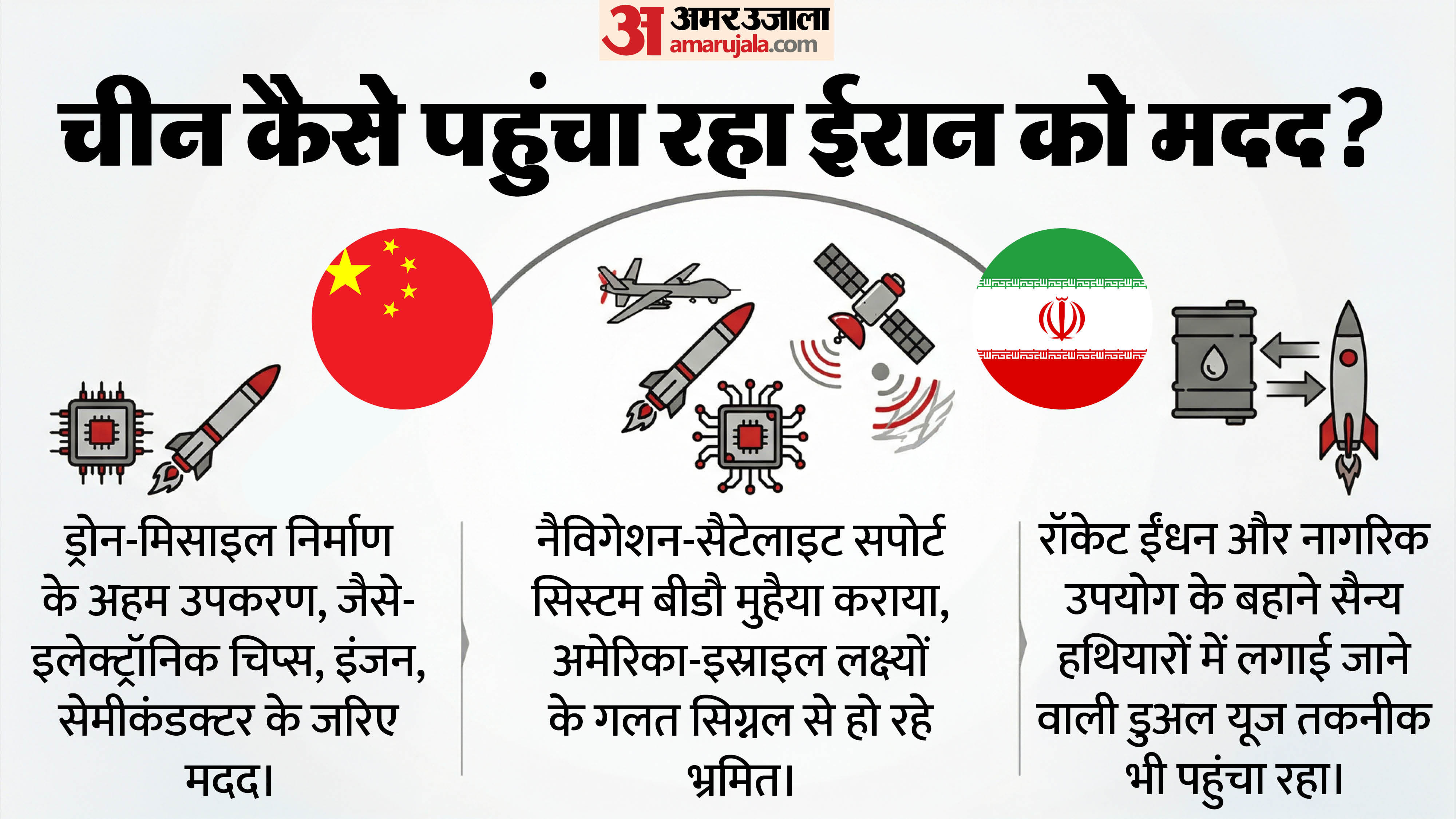 तकनीक और हथियारों के पुर्जों की सप्लाई: अमेरिकी थिंक टैंक अटलांटिक काउंसिल की रिपोर्ट के मुताबिक, चीन ईरान को ड्रोन, एंटी-शिप क्रूज मिसाइलों और सतह से हवा में मार करने वाली मिसाइलों के पुर्जे (जैसे सेमीकंडक्टर और बैटरी) लगातार मुहैया करा रहा है। चीनी अपने बिचौलियों के जरिए पश्चिम में इस्तेमाल होने वाली दोहरे उपयोग वाली तकनीक भी ईरान तक पहुंच रही है।नैविगेशन में मदद: चीन ने ईरान को अपने बीडौ (BeiDou) सैटेलाइट नेविगेशन सिस्टम का एक्सेस दिया है। ईरान इसका इस्तेमाल दुश्मन को बहकाने, डिकॉय (नकली) सिग्नल पैदा करने, अपनी सैन्य गतिविधियों को छिपाने और खतरे के विश्लेषण को भ्रमित करने के लिए कर रहा है।