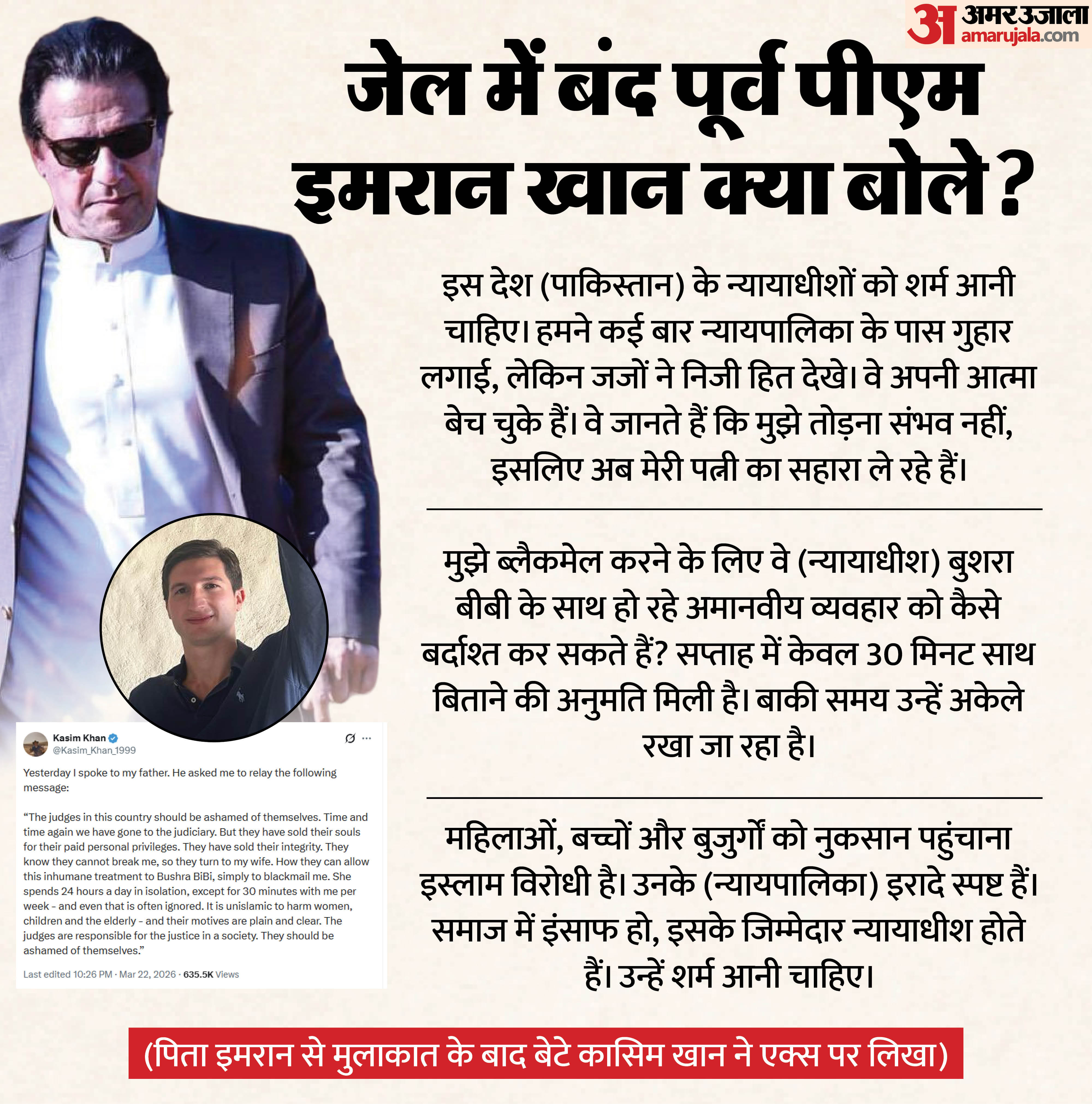 पूर्व PM इमरान खान का जेल से सख्त संदेश: कहा- आत्मा बेच चुके जजों को शर्म आनी चाहिए; बेटे कासिम ने क्या बताया?