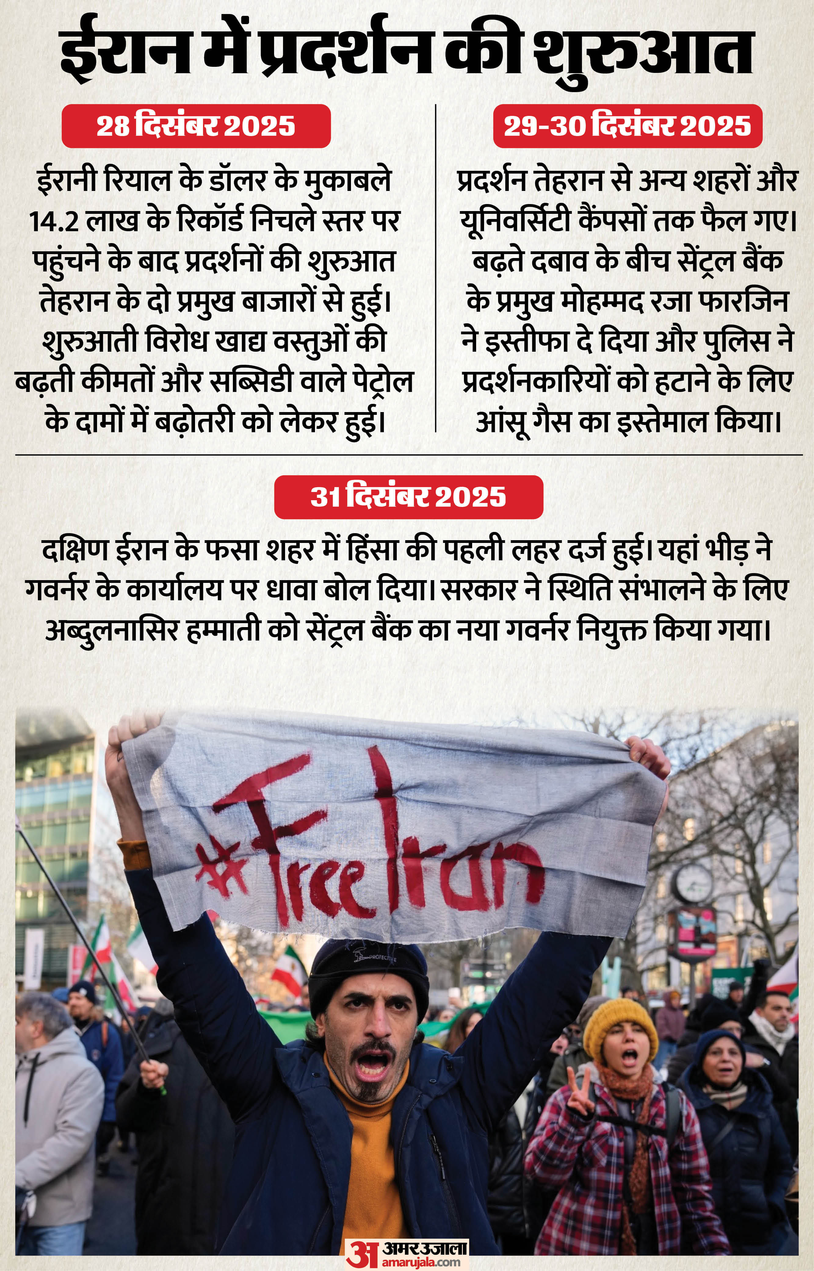 ऐसे में यह जानना अहम है कि आखिर ईरान में जो प्रदर्शनों का दौर जारी है, उसकी शुरुआत कहां से हुई और इसकी वजह क्या थी? दो हफ्ते में ईरान में ऐसा क्या-क्या हुआ है, जिससे प्रदर्शनों में सत्ता परिवर्तन की मांग उठने लगी है? इस आंदोलन के पीछे का चेहरा कौन है? यह प्रदर्शन कितने बड़े स्तर पर हैं? ईरान सरकार ने इनसे निपटने के लिए क्या किया है? इसे लेकर अंतरराष्ट्रीय स्तर पर क्या प्रतिक्रिया रही है? अमेरिका और उसके राष्ट्रपति डोनाल्ड ट्रंप ईरान के आंदोलनों को लेकर क्या तैयारी कर रहे हैं? आइये जानते हैं...