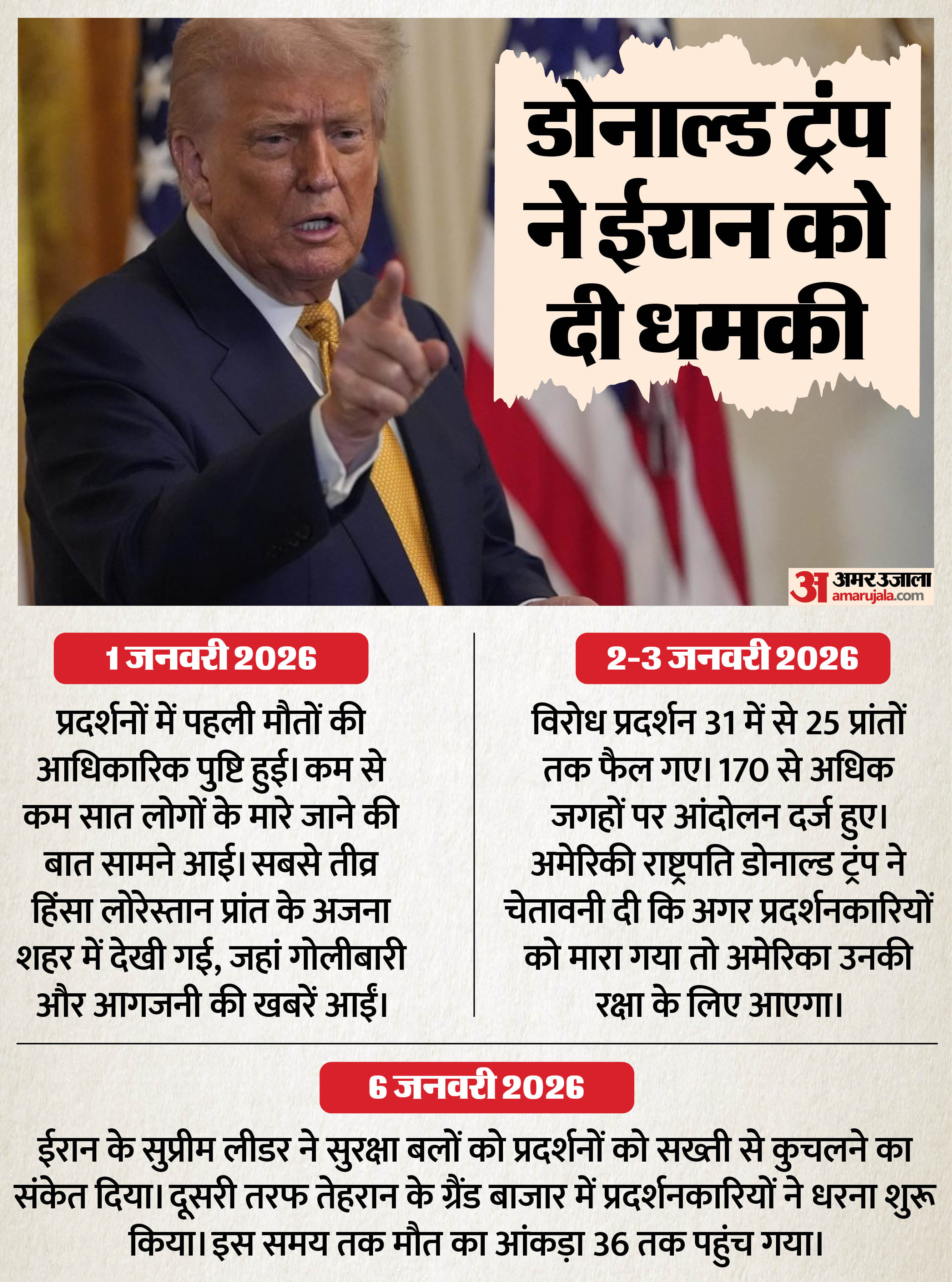 1. अमेरिका-ट्रंप ने दी हमले की चेतावनीअमेरिकी राष्ट्रपति डोनाल्ड ट्रंप ने अपने सोशल मीडिया प्लेटफॉर्म ट्रूथ सोशल पर ईरान के प्रदर्शनों को लेकर कड़ा रुख अपनाया है। उन्होंने हाल ही में कहा कि अमेरिका लॉक्ड एंड लोडेड यानी पूरी तरह तैयार है। उन्होंने चेतावनी दी कि अगर ईरानी सरकार शांतिपूर्ण प्रदर्शनकारियों को मारना जारी रखती है, तो अमेरिका उनकी रक्षा के लिए आएगा।