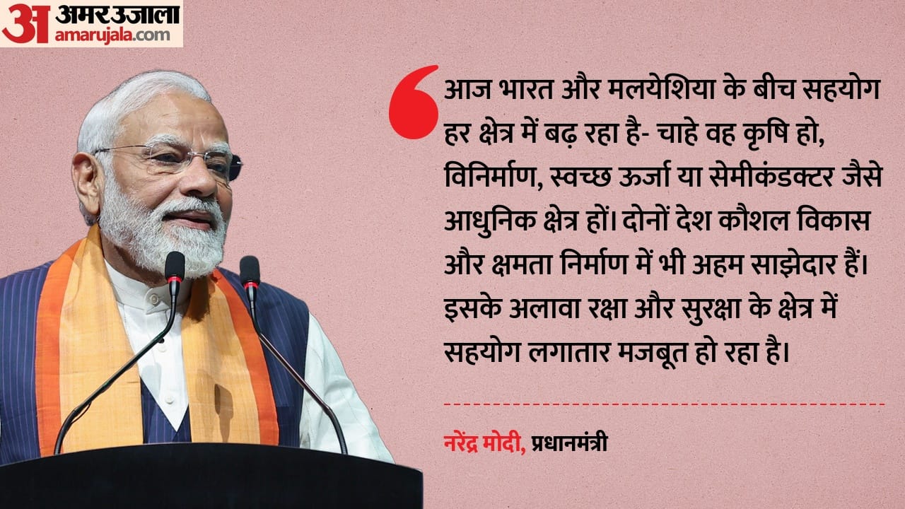 इस दौरान प्रधानमंत्री मोदी ने कहा कि वह भारत-मलयेशिया दोस्ती की ऊंचाई और गहराई दोनों को महसूस कर रहे हैं। उन्होंने बताया कि प्रधानमंत्री के रूप में यह उनका मलयेशिया का तीसरा दौरा है और अनवर इब्राहिम के कार्यकाल में उनसे यह चौथी मुलाकात है। उन्होंने कहा कि यही बात दोनों देशों के रिश्तों की गति और मजबूती को दिखाती है। हाल के वर्षों में द्विपक्षीय संबंधों ने जिस रफ्तार और गहराई को छुआ है, वह वाकई प्रेरणादायक है। प्रधानमंत्री मोदी ने आगे कहा कि आज भारत और मलयेशिया के बीच सहयोग हर क्षेत्र में बढ़ रहा है- चाहे वह कृषि हो, विनिर्माण, स्वच्छ ऊर्जा या सेमीकंडक्टर जैसे आधुनिक क्षेत्र हों। दोनों देश कौशल विकास और क्षमता निर्माण में भी अहम साझेदार हैं। इसके अलावा रक्षा और सुरक्षा के क्षेत्र में सहयोग लगातार मजबूत हो रहा है। उन्होंने मलयेशिया को आसियान की सफल अध्यक्षता के लिए बधाई दी और कहा कि मलयेशिया के सहयोग से भारत-आसियान रिश्ते और गहरे होंगे। प्रधानमंत्री मोदी ने जोर देकर कहा कि भारत-मलयेशिया संबंधों की असली ताकत लोगों के बीच के रिश्तों में है। मलयेशिया में रहने वाले लगभग 30 लाख भारतीय मूल के नागरिक दोनों देशों के बीच एक जीवंत सेतु की तरह हैं।